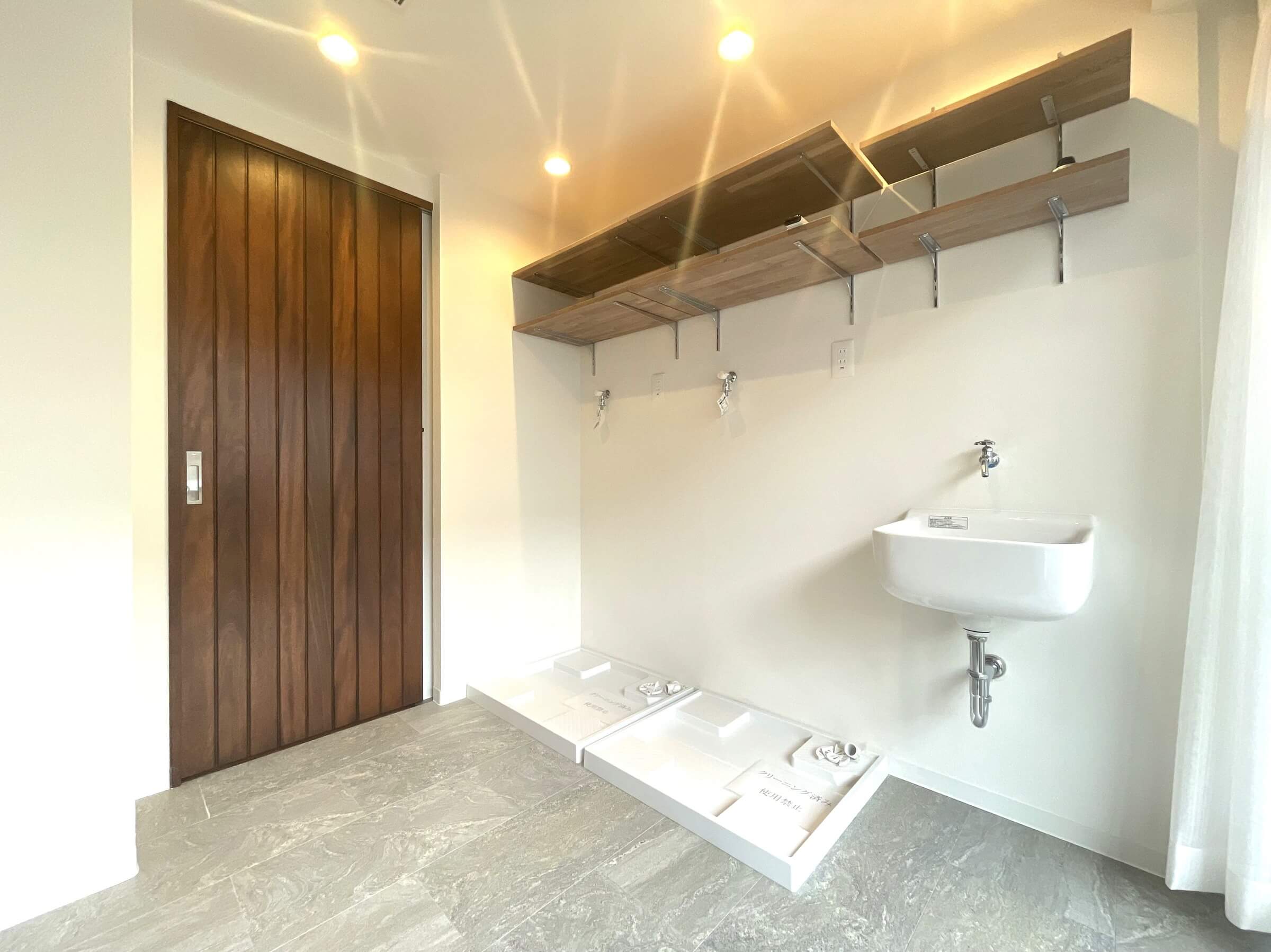 2台分の洗濯機パンを設置した、ゆとりあるユーティリティルーム。靴を洗ったり、つけ置き洗いなどに便利なスロップシンクが設置されています。室内干しもできる広さがあり、家事効率が上がりそうです。