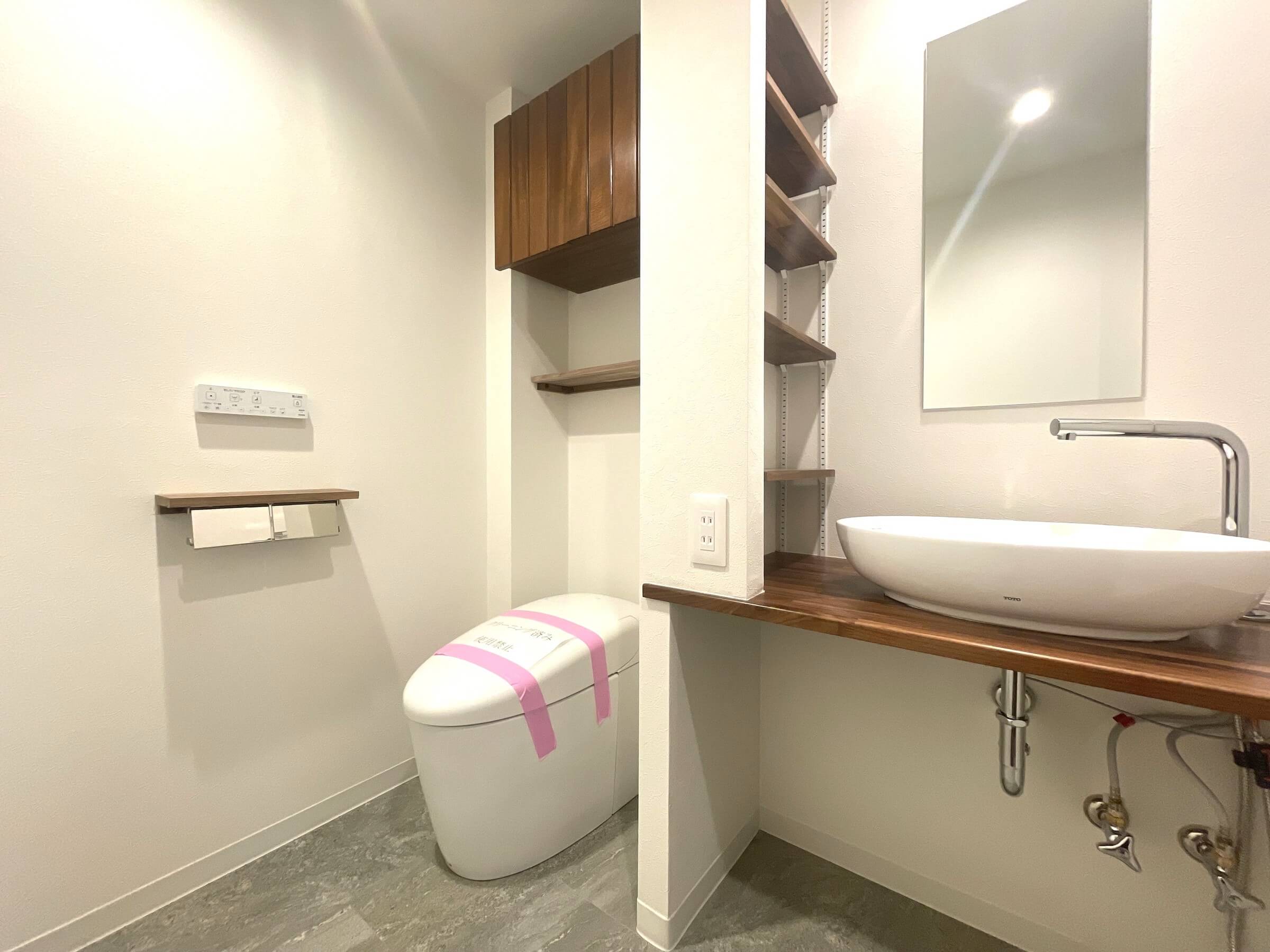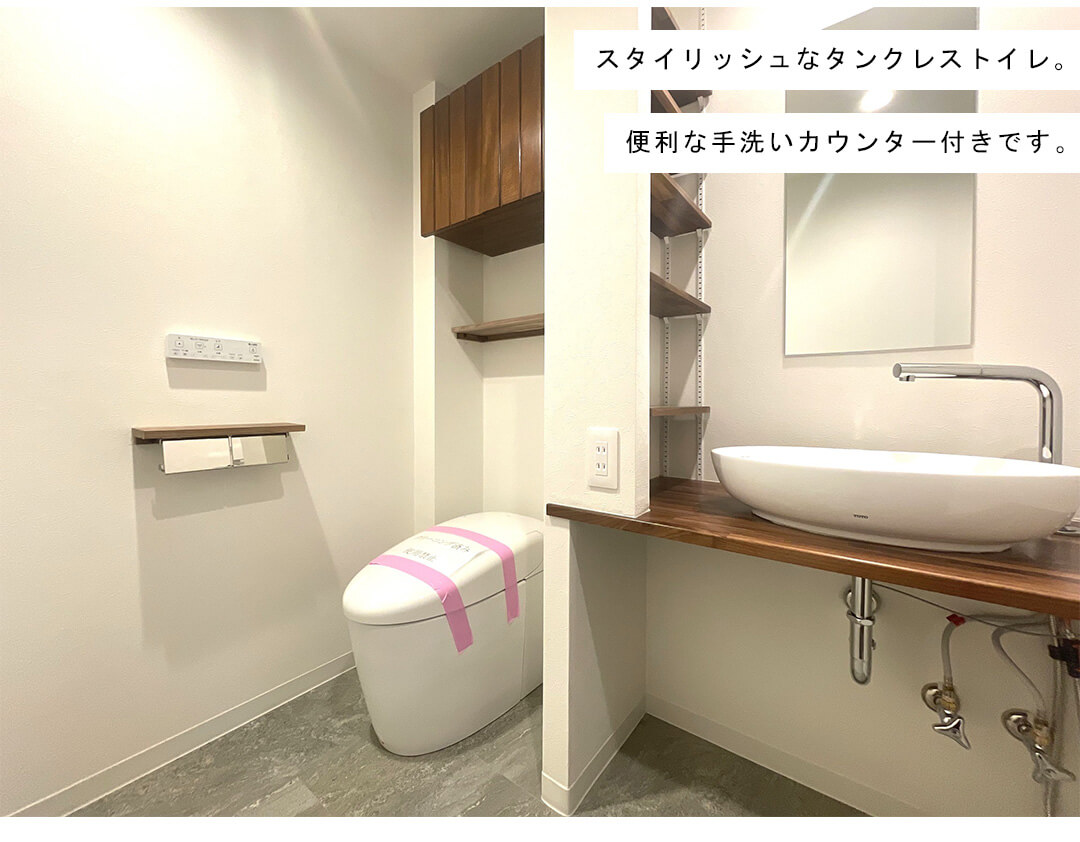 トイレは全部で3ヶ所に完備。寝室内、洗面室内と、もう1ヶ所は廊下の突き当たりにあります。独立性が高いので、ゲストにはこちらを使用してもらうと◎。スタイリッシュなタンクレストイレで、隣にはミラー付きの手洗いカウンターが設けられています。