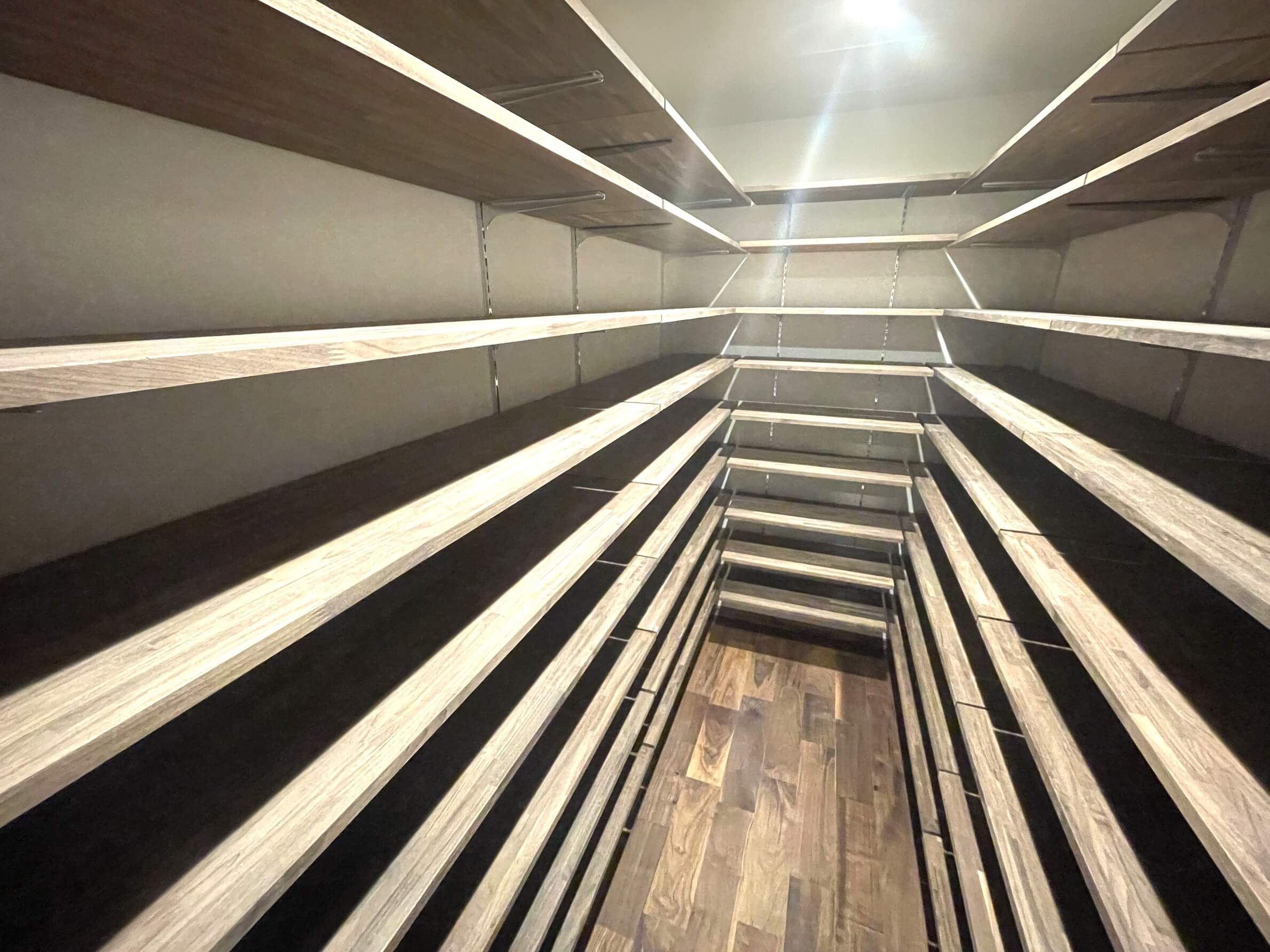 天井・フローリングに天然無垢材を使用した、温かみのある玄関ホール。高さのあるシューズボックスとSIC(シューズインクローゼット)を完備していて、収納性に優れた空間です。自由度の高い可動棚で、ロングブーツやレインシューズもすっきり収納可能。いつも清潔な空間をキープできます。