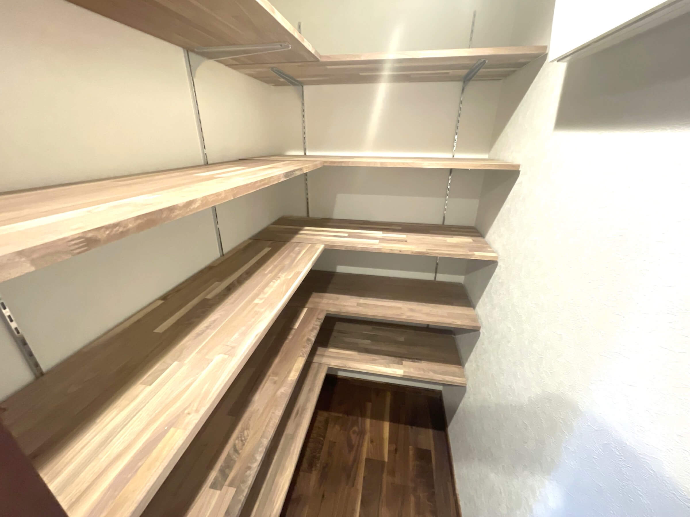 背面には収納力のあるカップボードを完備。キッチンと同じデザインで統一感があります。食料品のストックや食器類を整理整頓でき、散らかりがちなキッチンまわりがすっきり片付きそうです。