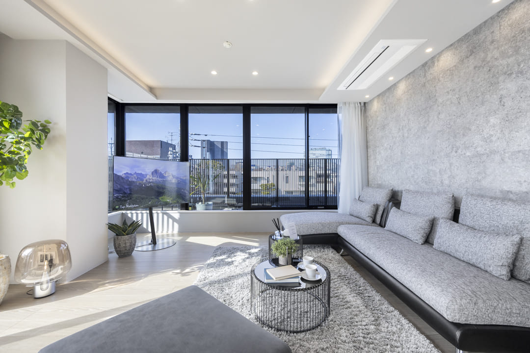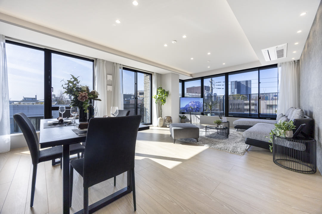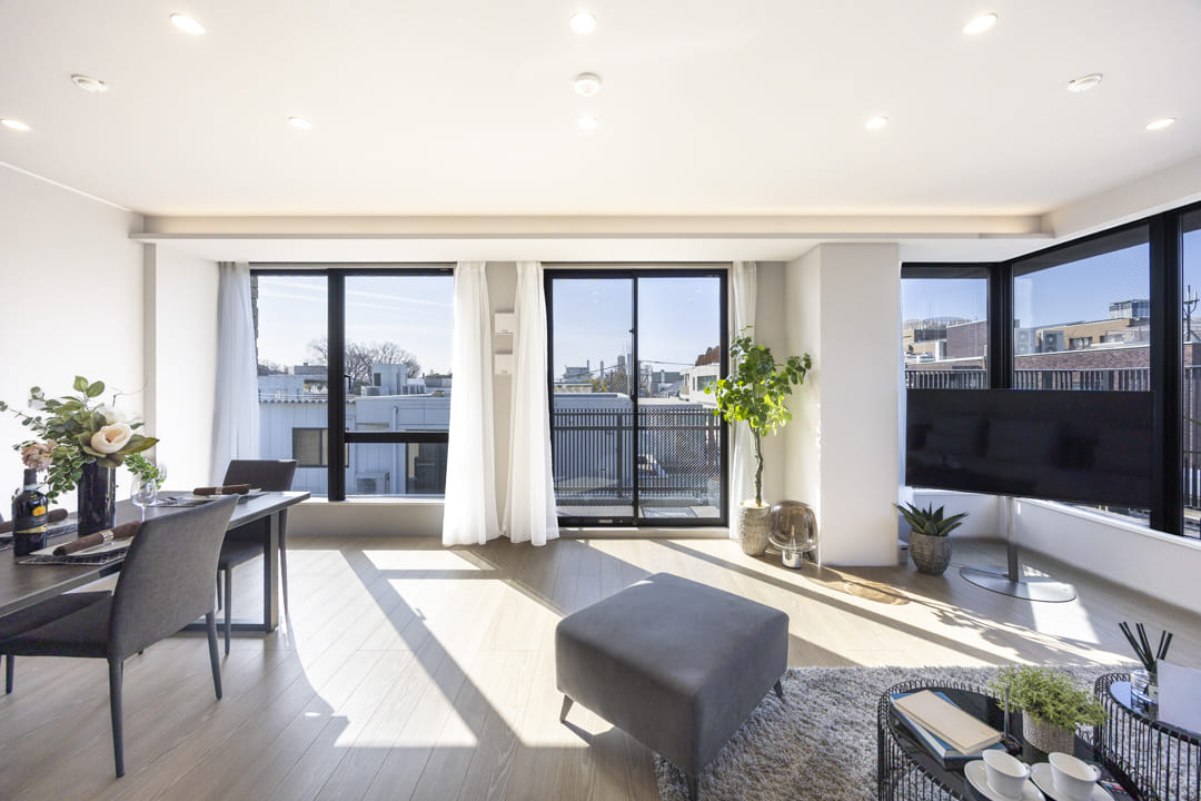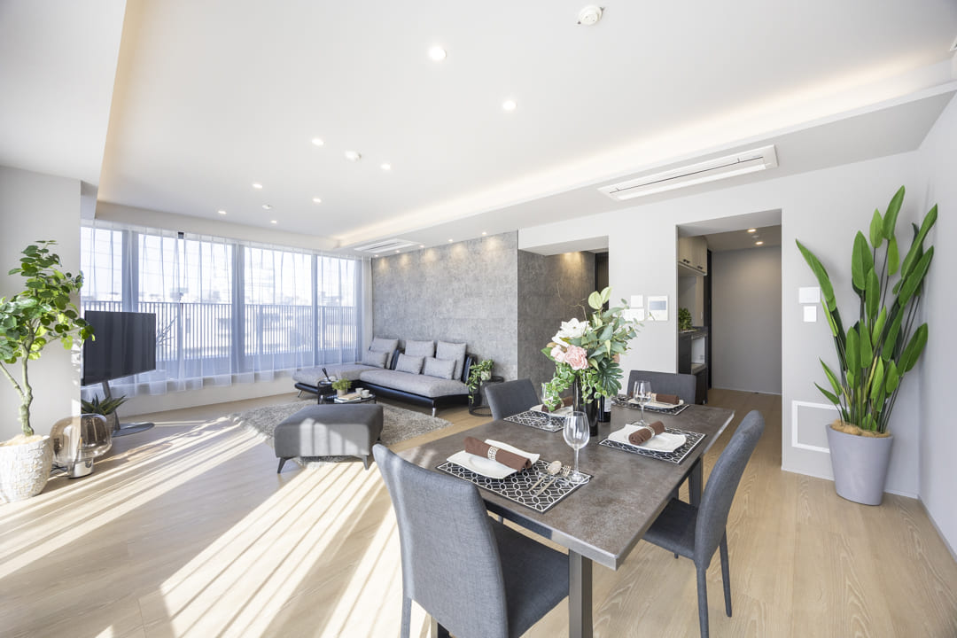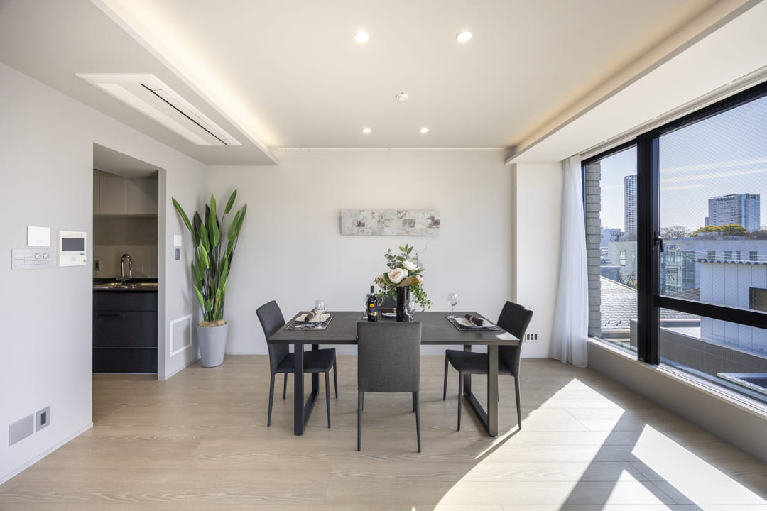 約22.0帖のリビングダイニング。南西・北西の2面に配された約2,300mmのハイサッシは、それぞれバルコニーとルーフバルコニーに面し、室内外が緩やかにつながる開放的な空間です。視線の先まで広がりを感じながら、光と風に包まれた穏やかな寛ぎの時間をお過ごしいただけます。