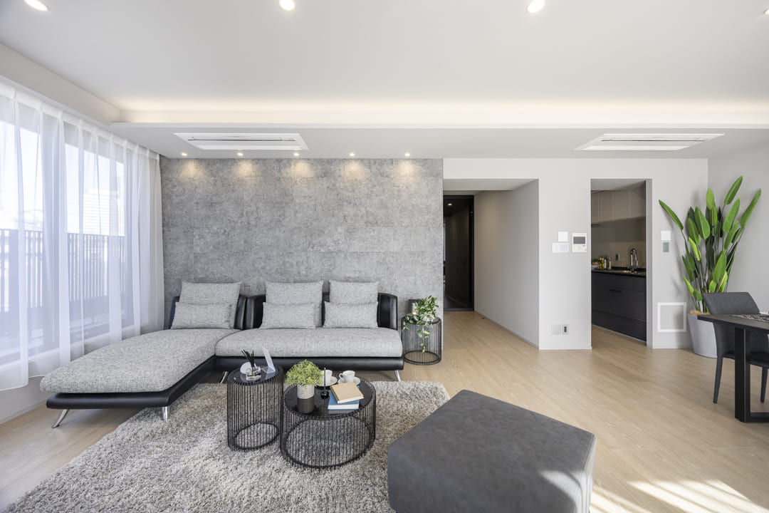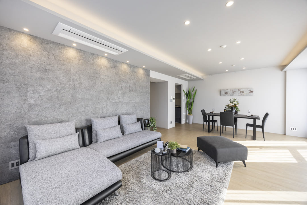 木目フローリングのナチュラルな風合いに、石調のアクセントウォールが美しく調和。間接照明がやわらかな陰影を描き、落ち着きのある上質な空間を演出します。ピクチャーレールを活用して、アートや植物を飾るなど、自分らしい住まいづくりも楽しめます。