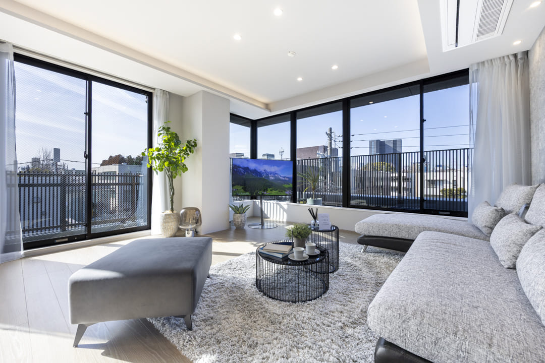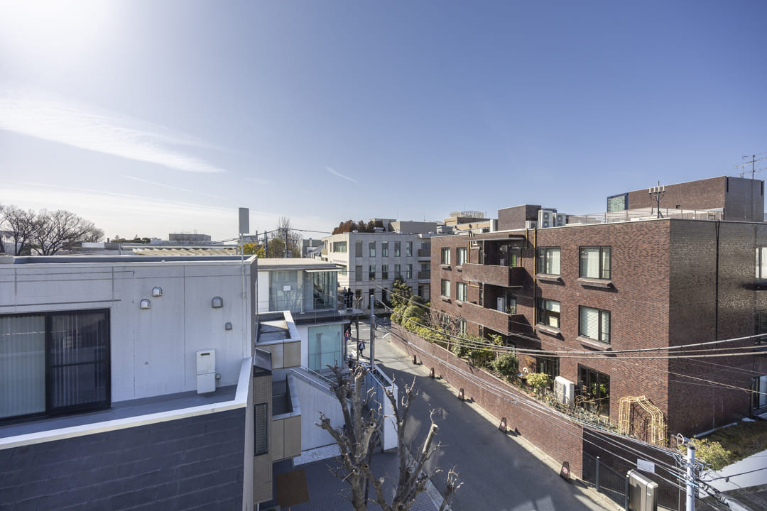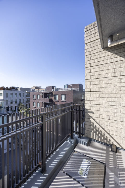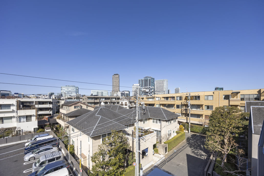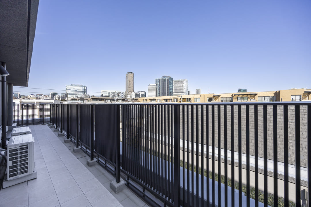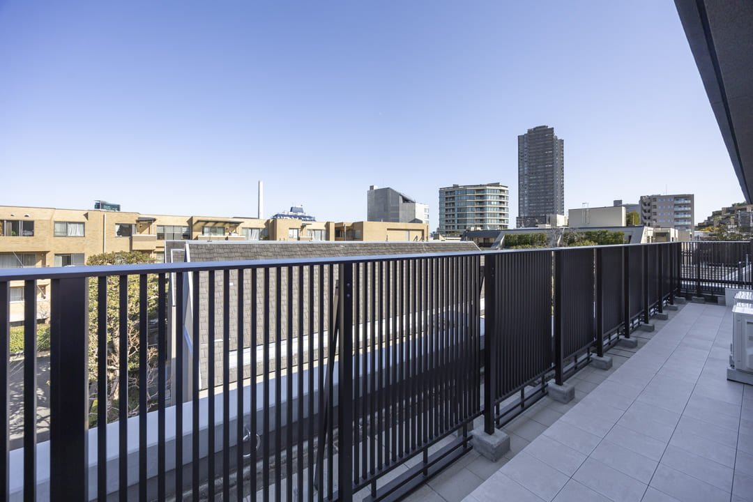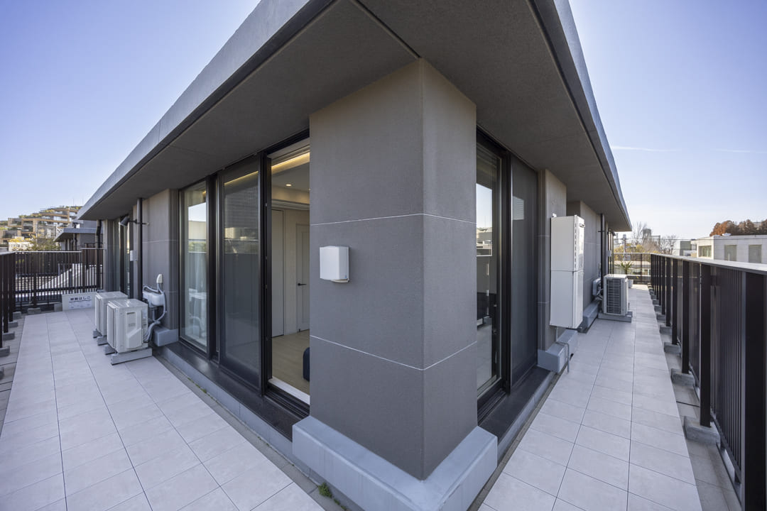 全居室に跨るL字型のルーフバルコニー。最上階・約37.17㎡のゆとりあるスペースに磁器タイルを施し、上質な屋外空間が広がります。周辺は低層住宅が多く、視界が開けた眺望も魅力。遠くまで広がる青空と、街に点在する木々の緑を望めます。蛇口付きで、ガーデニングや日常のお手入れにも便利です。