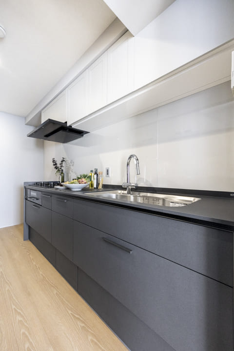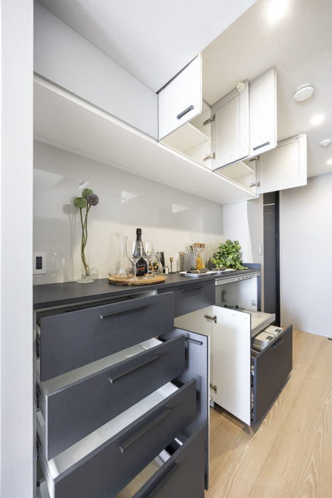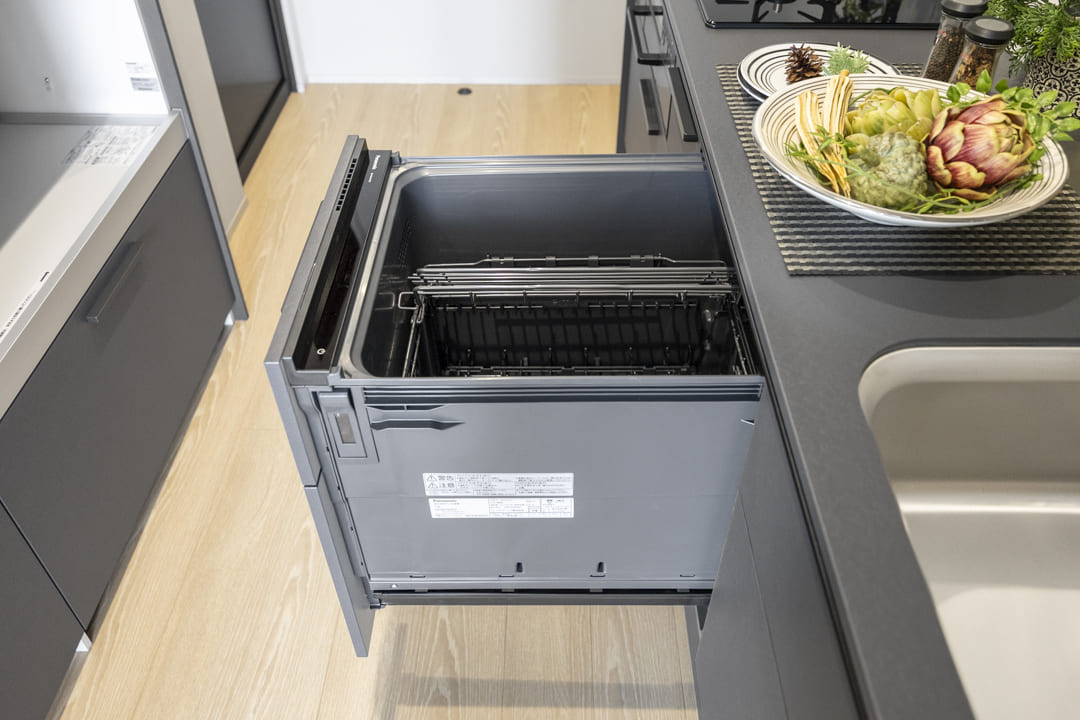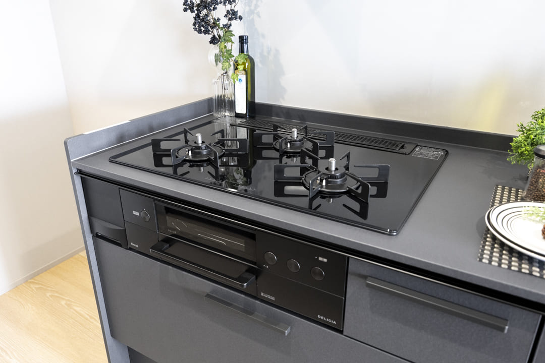 同時調理が叶うグリル付3口ガスコンロを内蔵。さらに、ディスポーザーと食洗機も完備されています。料理後すぐに生ゴミを処理できるので、悪臭の原因を防ぎ、掃除の手間を軽減。食器洗いも捗り、後片付けの時短が叶います。