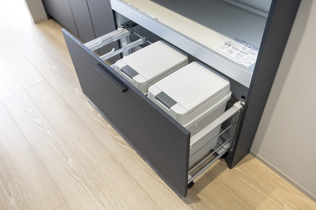 背面には収納力のあるカップボードを完備。キッチンと同じデザインで統一感があります。食料品のストックや食器類を整理整頓でき、散らかりがちなキッチンまわりがすっきり片付きそうですね。ワゴン式のダストボックスが備わっているのも嬉しいポイントです。
