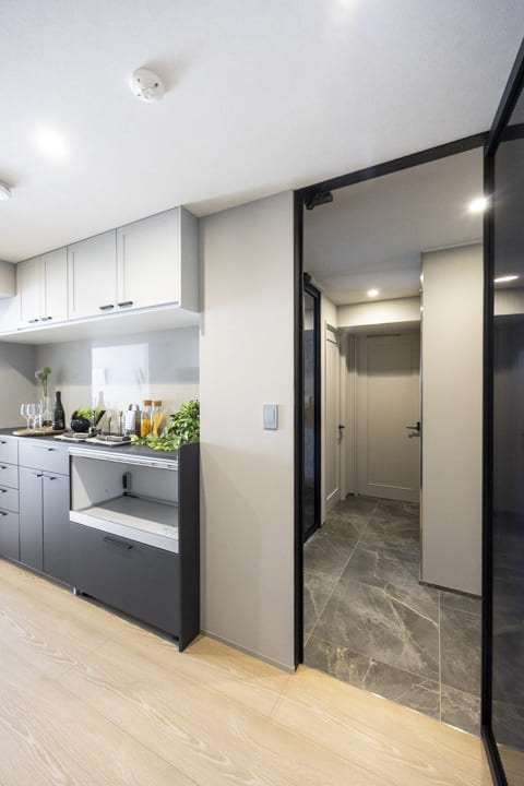 約4.5帖のゆとりあるキッチンスペース。床暖房を備えており、寒い季節も快適に作業が行えます。独立性の高い間取りのため、作業に集中しやすく、においが生活スペースへ広がりにくいのも嬉しいポイント。来客時には、生活感が出やすいキッチンまわりをさりげなく目隠しできるのも魅力です。
