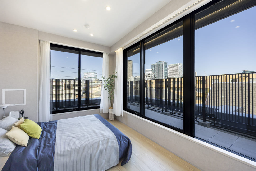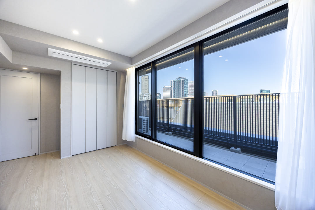 約7.8帖の寝室1。ルーフバルコニー付きの開放的な空間です。洋室で最も広いので、主寝室におすすめですよ。大開口の窓に加え、ビルトインエアコンですっきりとした印象に。床暖房付きで寒い季節も快適にお過ごしいただけます。