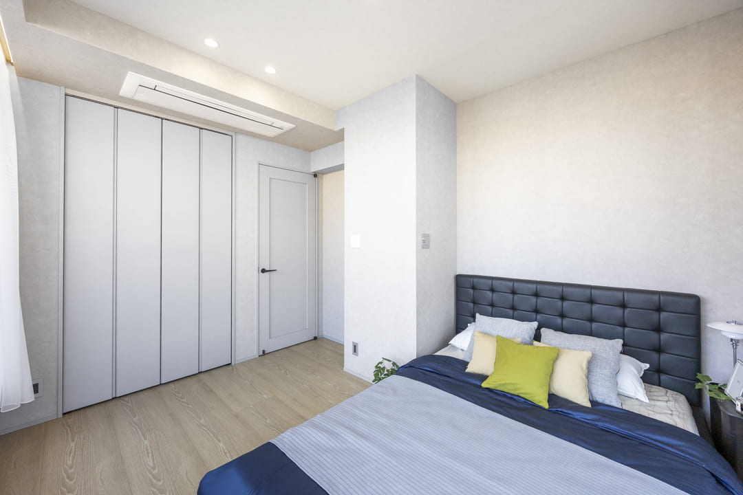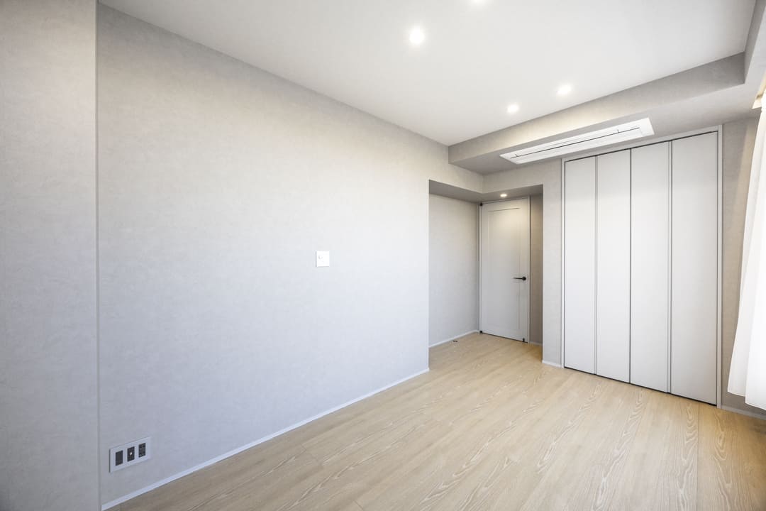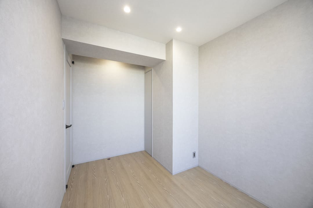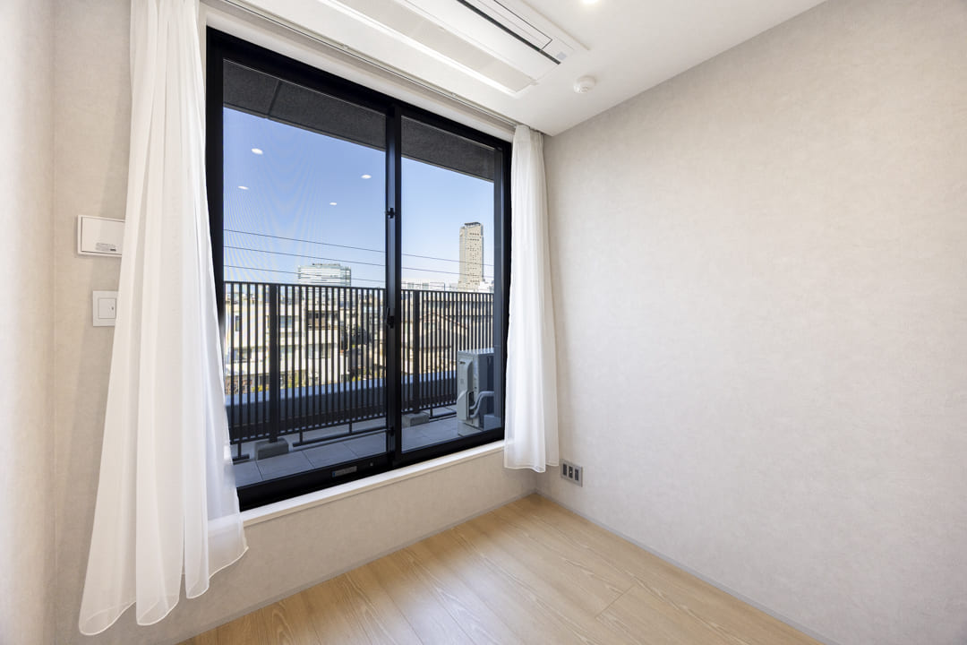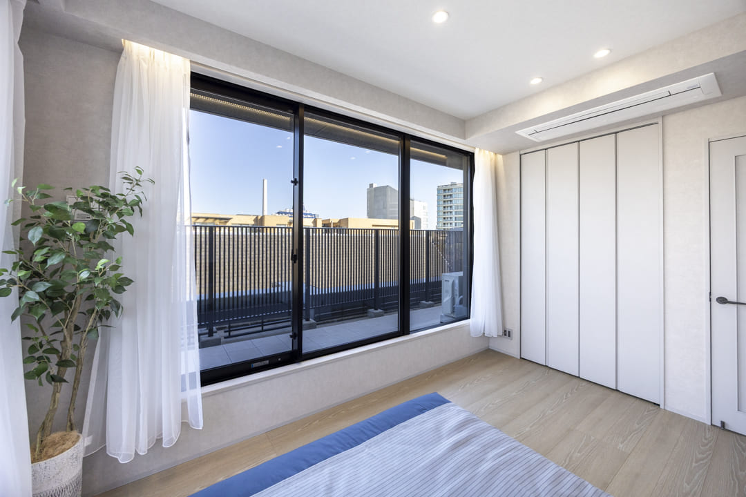 向かい側にあるのは約7.0帖の寝室2です。ルーフバルコニーに面する2面窓により、視線が抜け、伸びやかに感じられる空間。風通しも良く、心地よくお過ごしいただけます。4枚折れ戸のクローゼットには奥行きがあり、収納性の高さも魅力的ですよ。子ども部屋にいかがでしょうか?