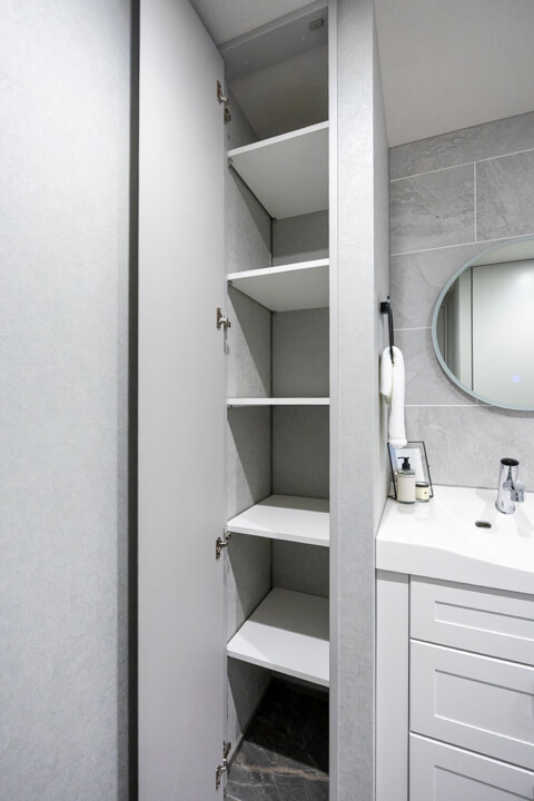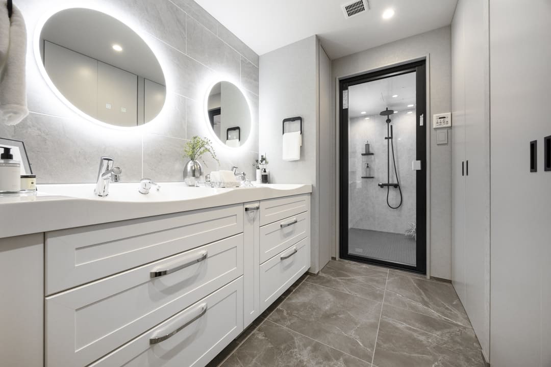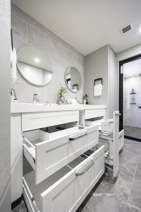 間接照明が施された丸いミラーが印象的。ホテルライクな2ボウル仕様の洗面化粧台です。2人並んで使用でき、忙しい朝の身支度もスムーズに行うことができます。大開口の洗面ボウルはカウンターと一体成型で、汚れが溜まりづらくお手入れしやすいのも嬉しいですね。洗面台本体の収納に加え、大容量の可動棚&リネン庫を備え、いつも清潔な洗面室をキープできます。