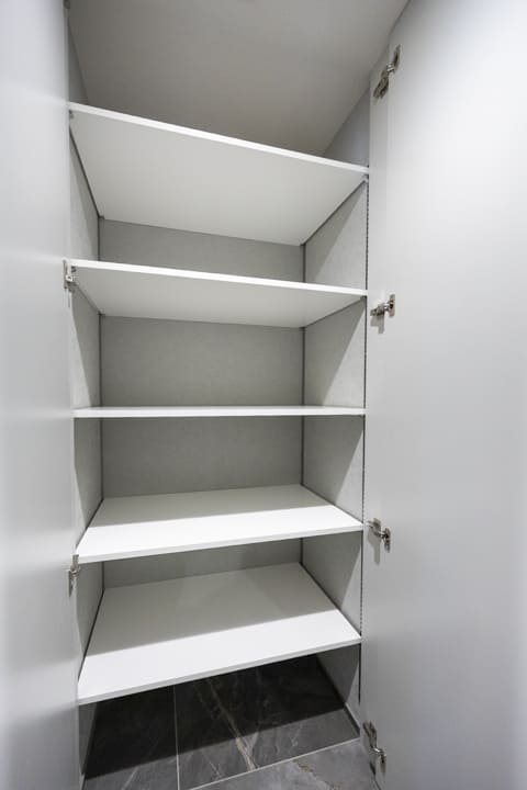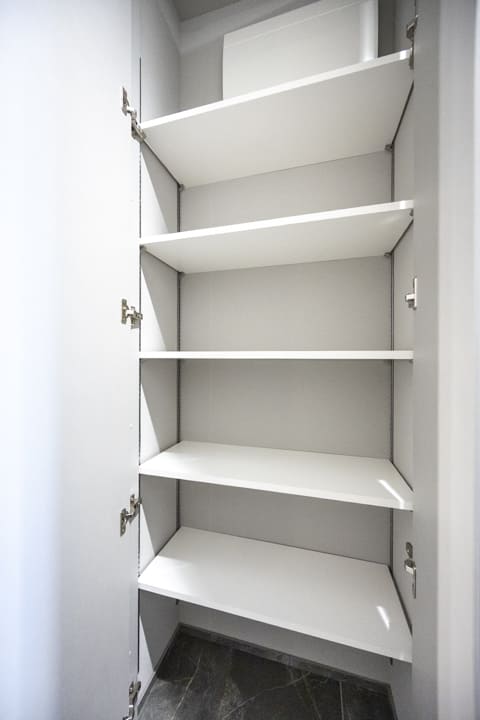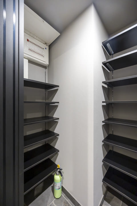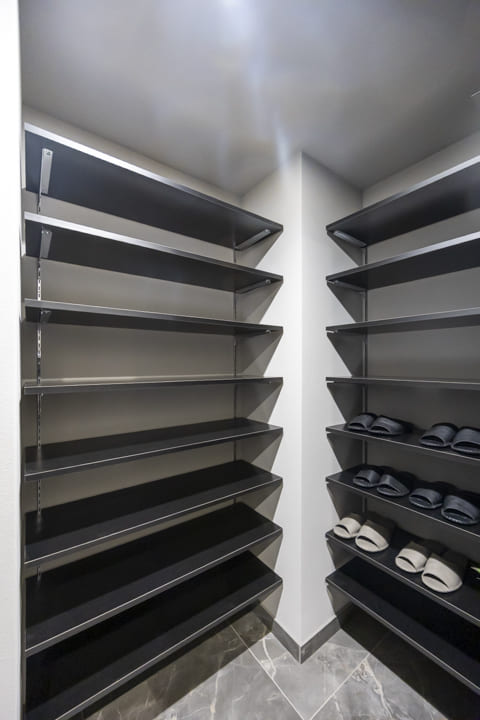 大容量のSIC(シューズインクローゼット)を備え、収納豊富◎。自由度の高い可動棚で、ロングブーツや雨具などもすっきり収納できます。廊下にも物入があり、日用品ストックやペットグッズの収納に重宝しそうです。