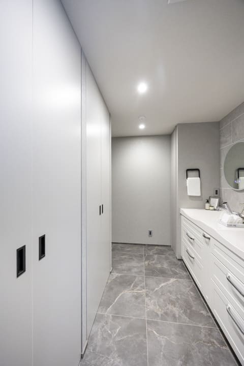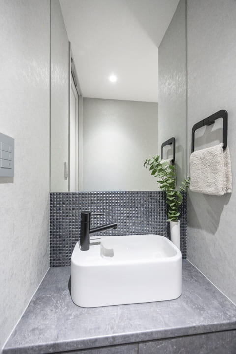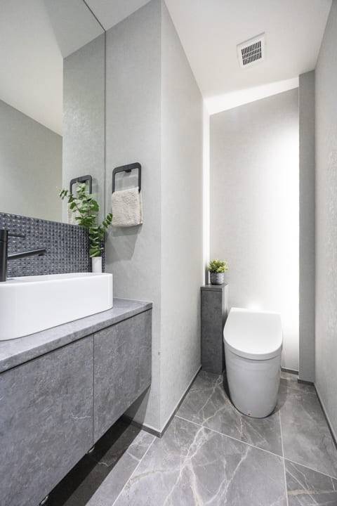 廊下に面していて独立性の高いレストルーム。間接照明が心地よい、上質な空間です。TOTO製の洗浄機能付トイレに交換済み。タンクレス仕様でスタイリッシュですね。手洗いカウンターが設置されているのですぐに手を洗うことができ、ゲストを洗面室まで案内する手間がかからないのも嬉しいポイントです。