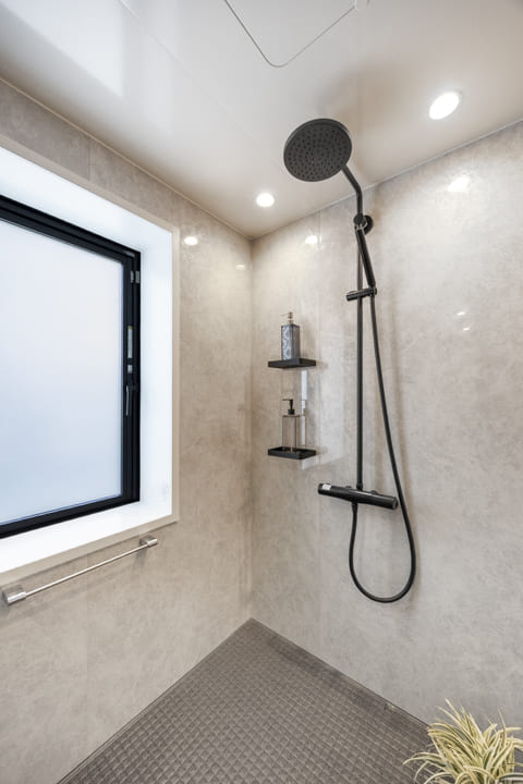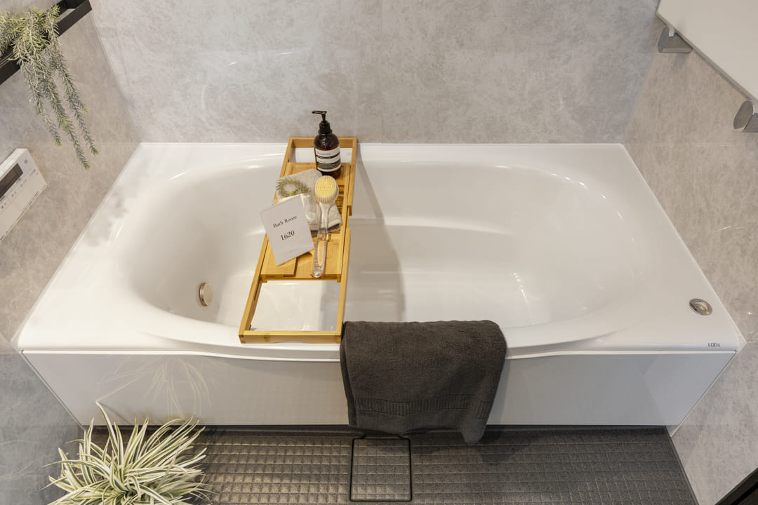 ゆったり入浴できる1620サイズのバスルーム。ルーフバルコニーに面する窓付きで、開放感があり、自然換気できるのも嬉しいポイントです。浴室換気乾燥暖房機・追い焚き機能搭載で、1年中快適なバスタイムに。シャワーは2種類設置されていて、使い分けが可能です。全身でシャワーを浴びることができるオーバーヘッドシャワーでは、高い保温効果が期待できますよ。