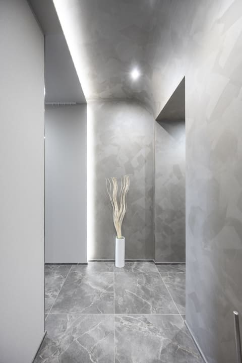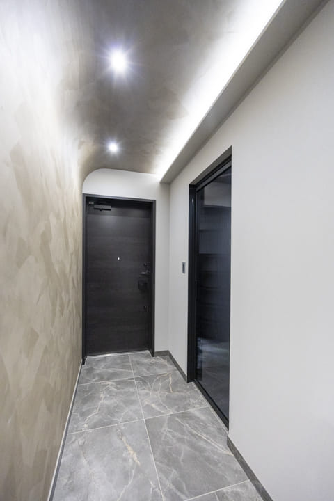アールを描く天井デザインが印象的な玄関ホール。大理石調タイルに、アクセントウォールと間接照明を組み合わせ、ホテルライクな空間を演出します。