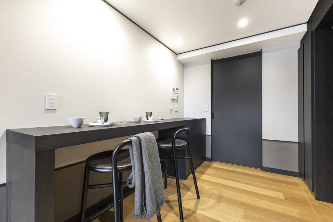 キッチン側にはカウンターを備え、食事スペースとしてはもちろん、ワークスペースや家事の合間の作業にも活躍。さらに造作棚も設けられており、日用品や書籍、小物類をすっきりと収納できます。生活感を抑えながら、整った居住空間を保てる設計です。