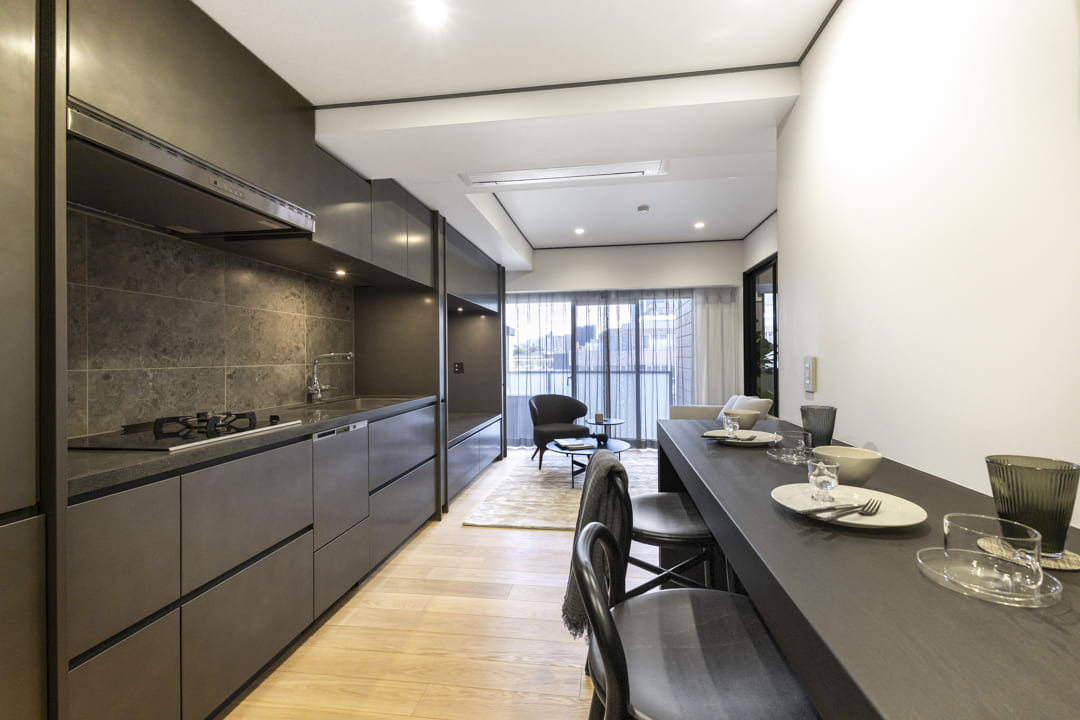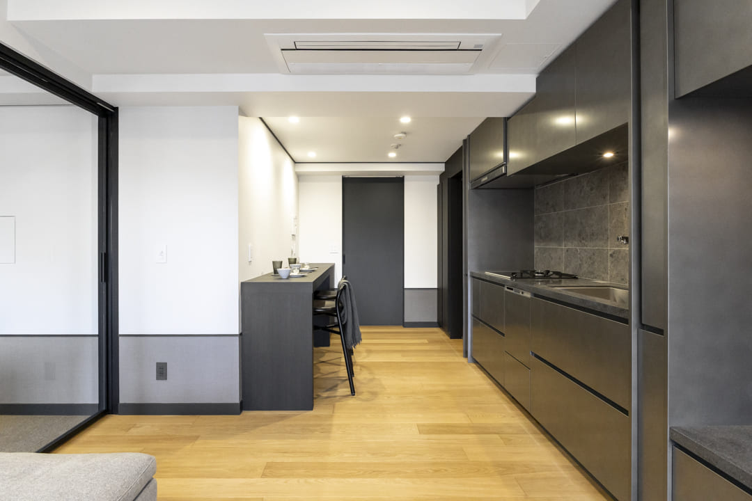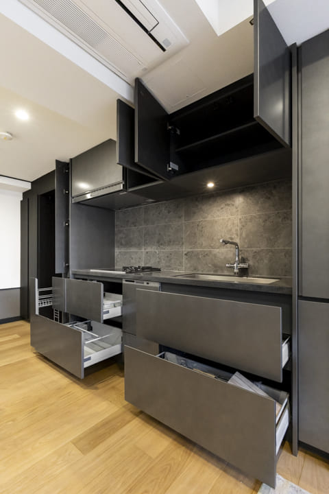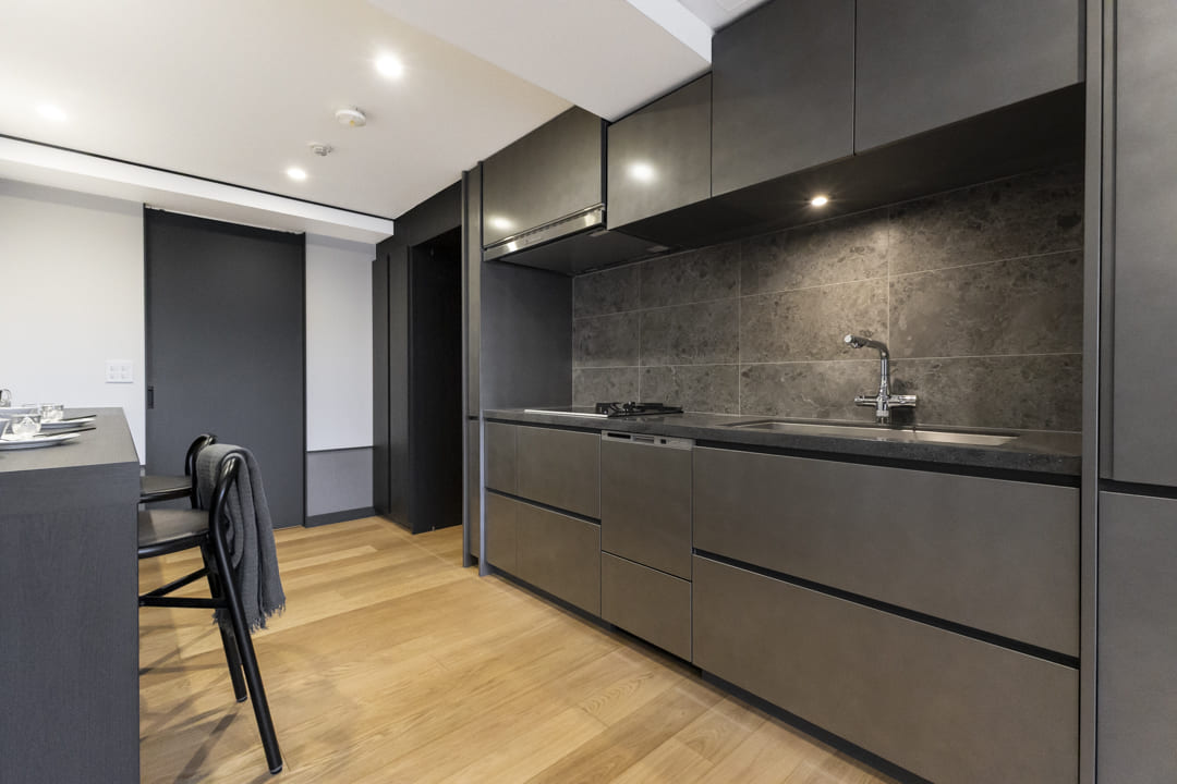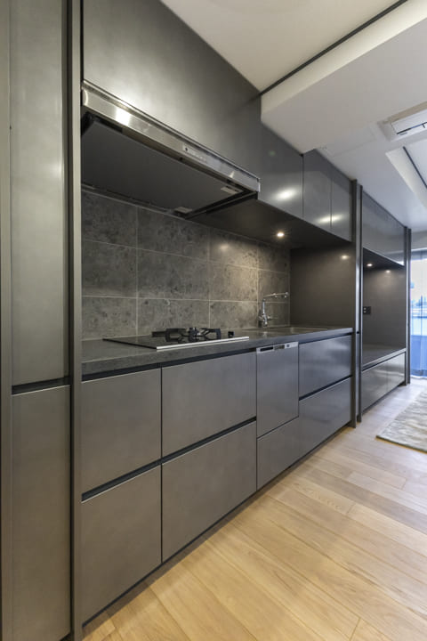 ステンレス扉が空間に程よい緊張感を添える、ミニマルなデザインのキッチン。壁付けとすることで作業に集中しやすく、住空間との距離感も心地よく保たれています。収納力にも優れ、日常使いのしやすさと清潔感を両立したスペースです。
