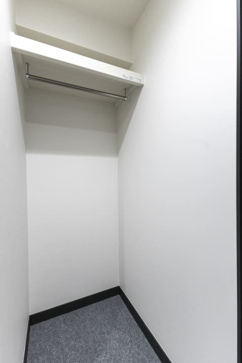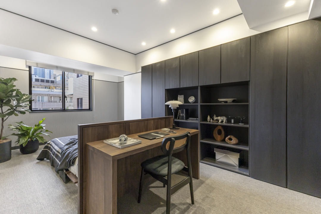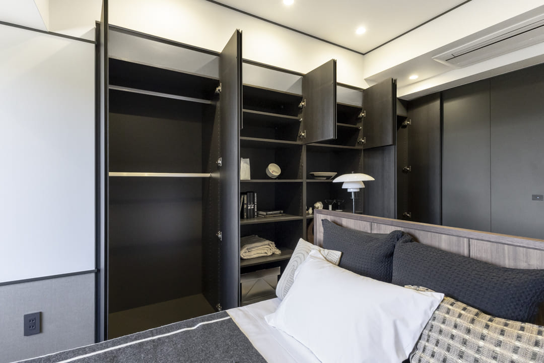 備え付けのクローゼットは、オープン棚と扉付き収納を組み合わせた仕様。お気に入りの衣類や小物は“見せる収納”としてディスプレイしつつ、生活感の出やすいものはすっきりと隠すことができ、空間を美しく保つことができます。