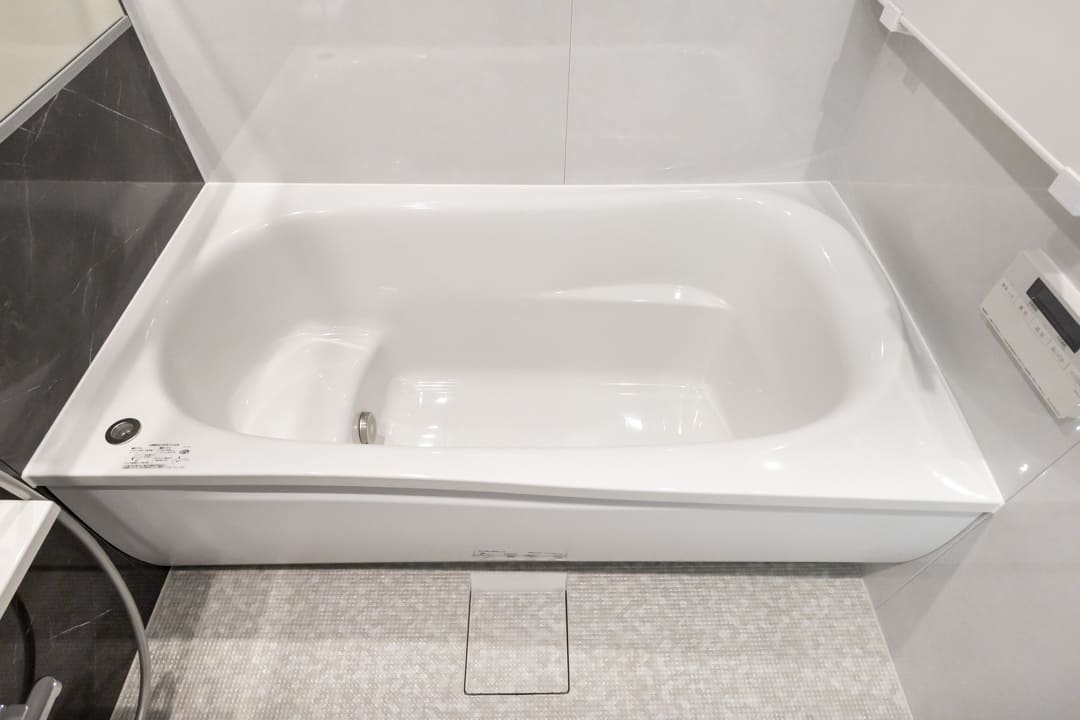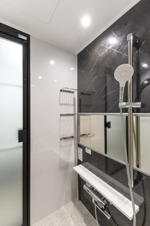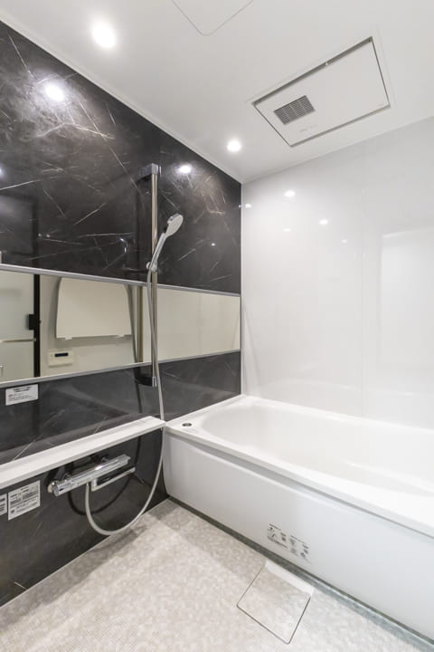 大理石柄のアクセントパネルが高級感を演出するバスルーム。1418サイズです。ワイドミラーが奥行きをもたらし、広々とした印象です。換気・暖房・乾燥・涼風機能付きで1年中快適なバスタイムに。追い焚き機能&浴槽ベンチ付きで、ゆっくり半身浴をお楽しみいただけます。