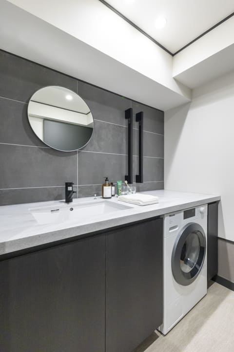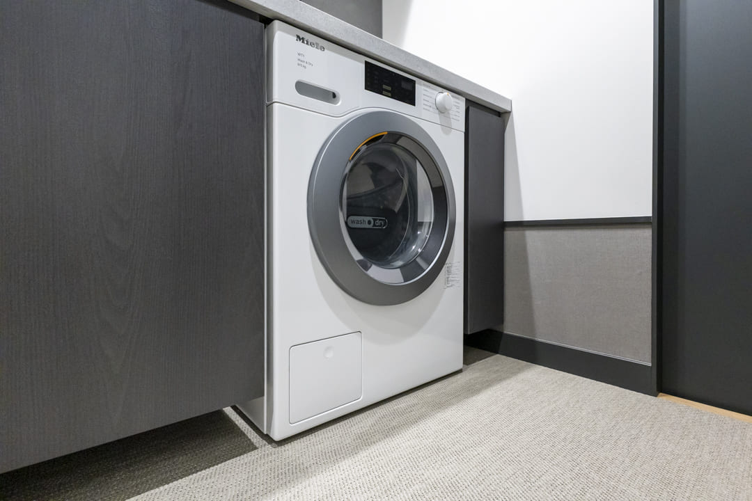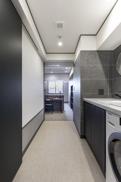 グレー基調で洗練された印象の洗面室。広々としたカウンターが印象的な洗面化粧台が設置されています。化粧品やドライヤーの仮置きができ、忙しい朝の身支度も落ち着いて行えそうですね。足元にはMiele(ミーレ)製のドラム式洗濯乾燥機が備わっていて、お洗濯時間が快適に。縦型と比べて衣類にやさしく、乾燥時間の短縮・電気代の節約にもなります。