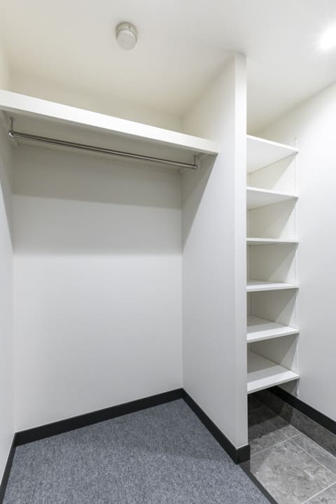 奥行きのあるクローゼットに加え、WIC(ウォークインクローゼット)を完備し、収納力も充実。衣類はもちろん、鞄や帽子などの小物類から、トランクケースやゴルフバッグといった大きな荷物まで収めることができ、居室空間をすっきりと保てます。WICは玄関とも繋がる回遊動線を形成しており、帰宅後の動線がスムーズなのも魅力。身支度から外出までをストレスなくこなせる、機能性に配慮された設計です。