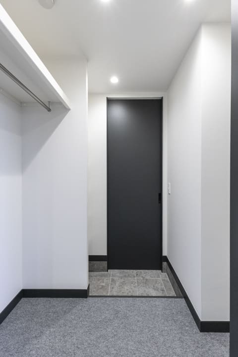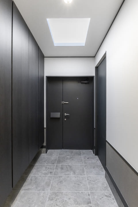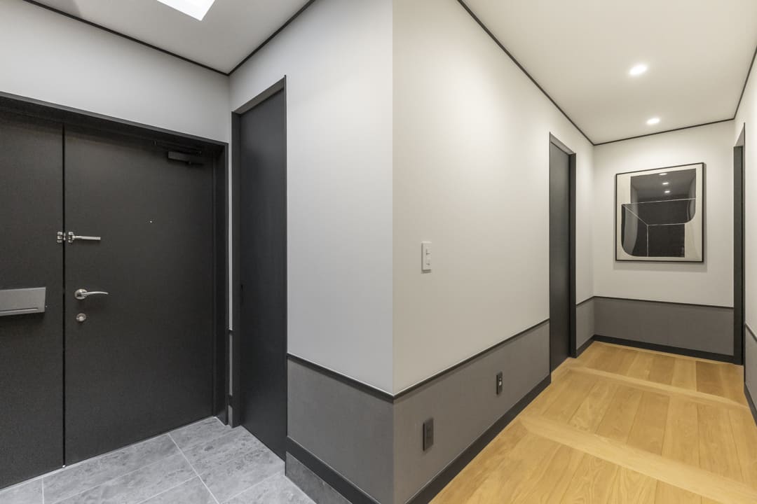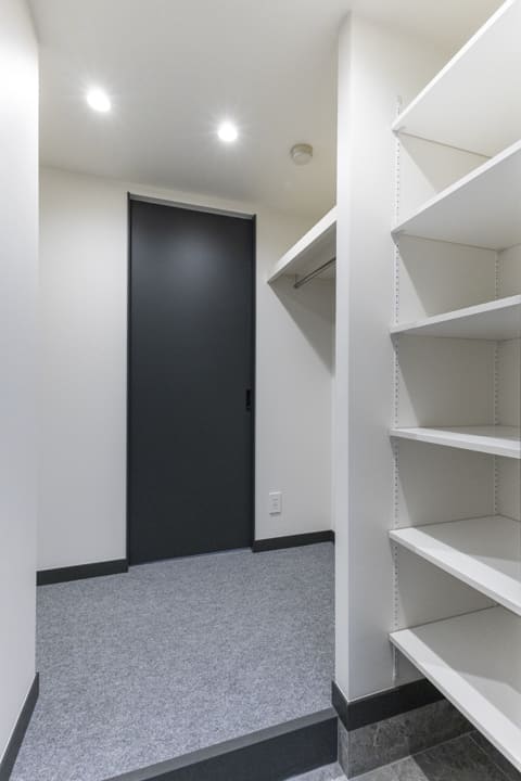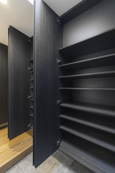 トップライトからやわらかな光が注ぐ、明るく開放感のある玄関ホール。居室と統一感のあるグレーの腰壁が、空間全体に上質な印象をもたらします。可動棚仕様の大容量シューズボックスを備え、靴の量やサイズに合わせてすっきりと収納可能。さらにWIC(ウォークインクローゼット)へと繋がる動線により、帰宅後すぐにコートや上着を掛けられ、日々の暮らしを衛生的に整えます。