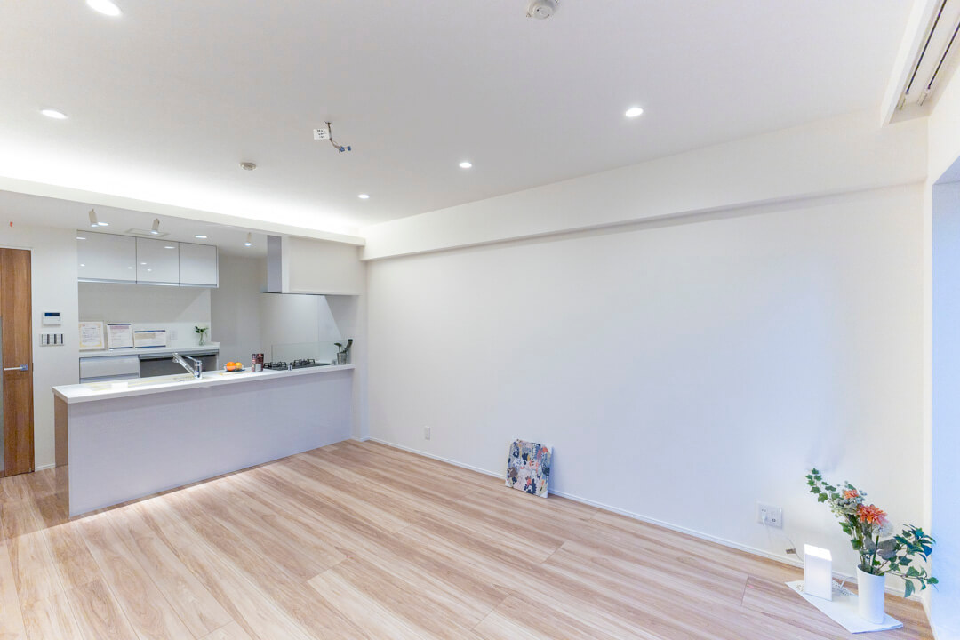 キッチンスペースを含め、約13.8帖のLDK。自然な光が入る南向きで、室内からでも眺望良好です。天井には間接照明が施されていて、空間をやさしく照らし、演出性も高めてくれます。また、床暖房が設置されており、冬場も足元からじんわりと温まれます。床に直接座ったり、寝転んでもひんやり感なく暖かく過ごせます。