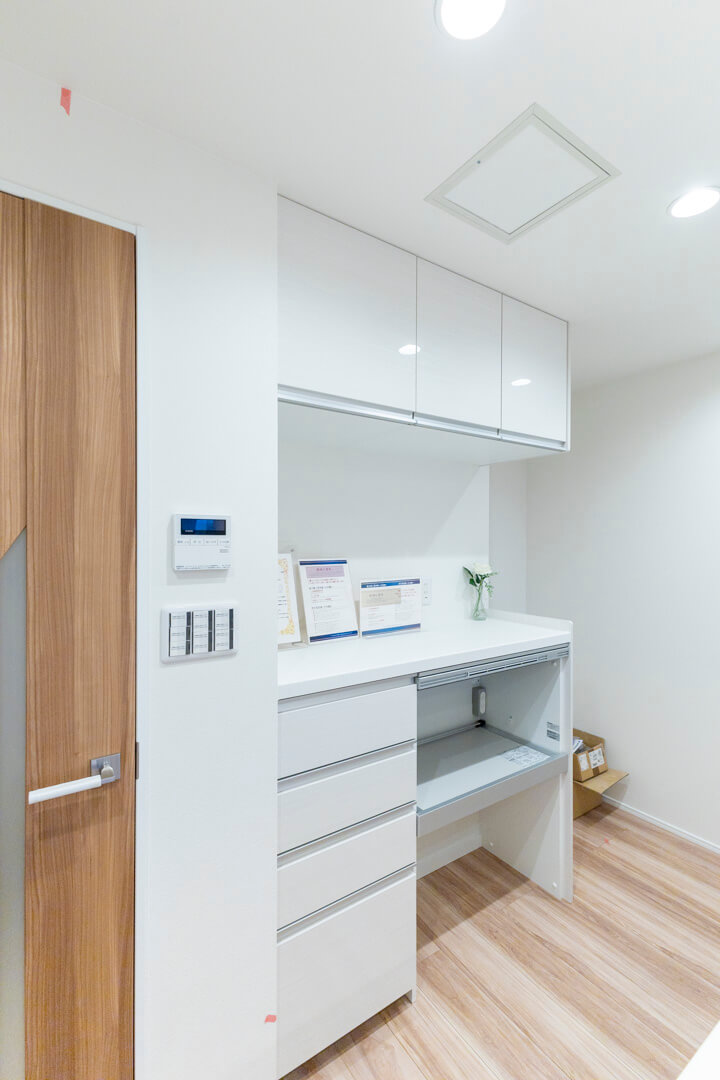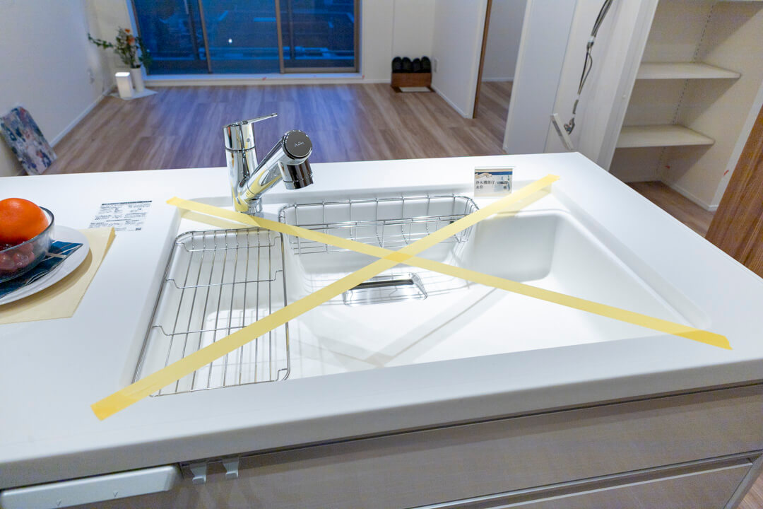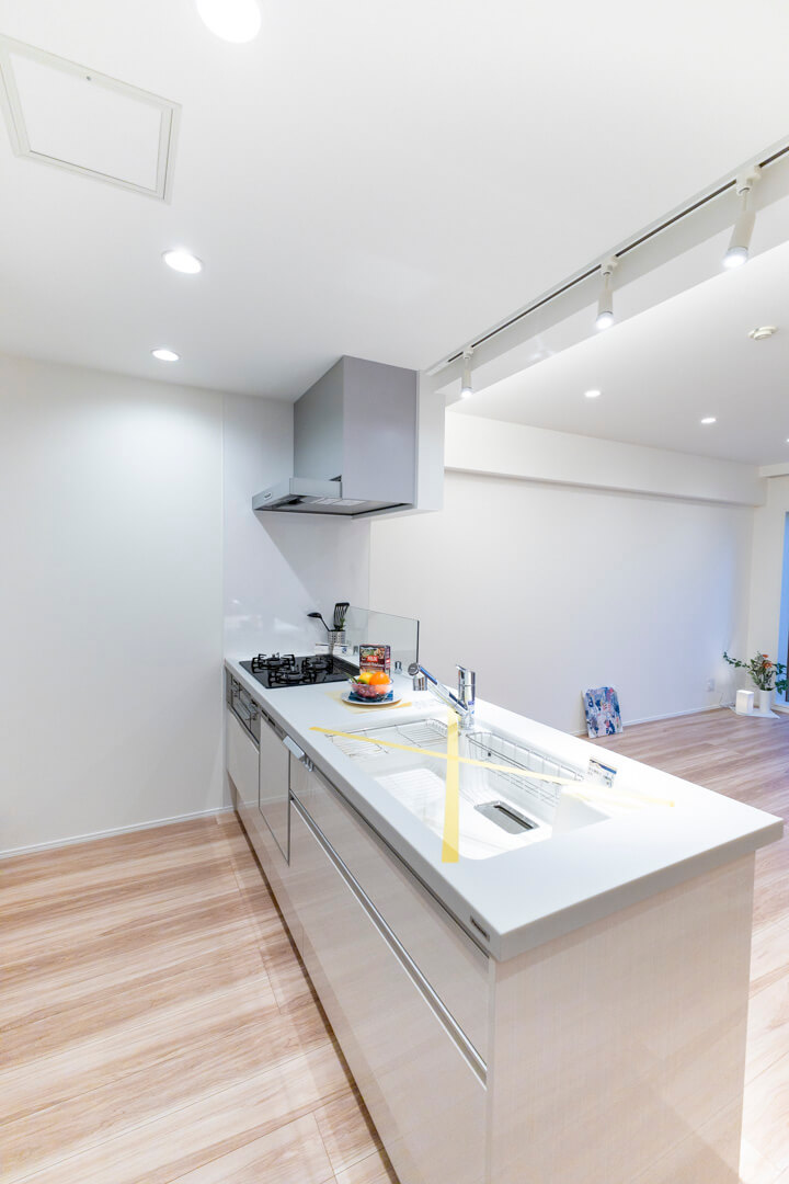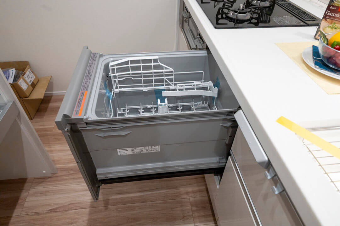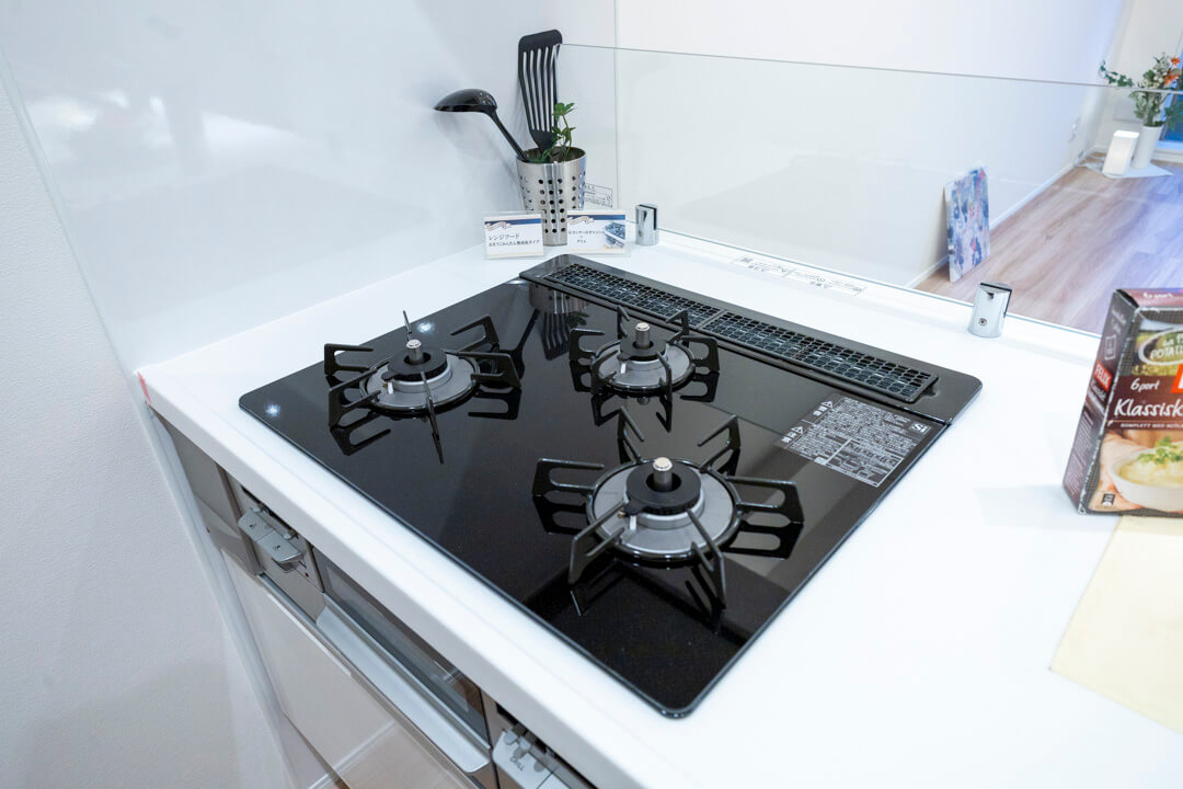 リビングダイニングが見渡せる開放的なオープンキッチン。家族やゲストとコミュニケーションが取りやすくなっています。料理が捗る3口ガスコンロ、家事の時短に心強い食洗機付き。カップボードも設置されていて、収納スペースもしっかりと確保されています。