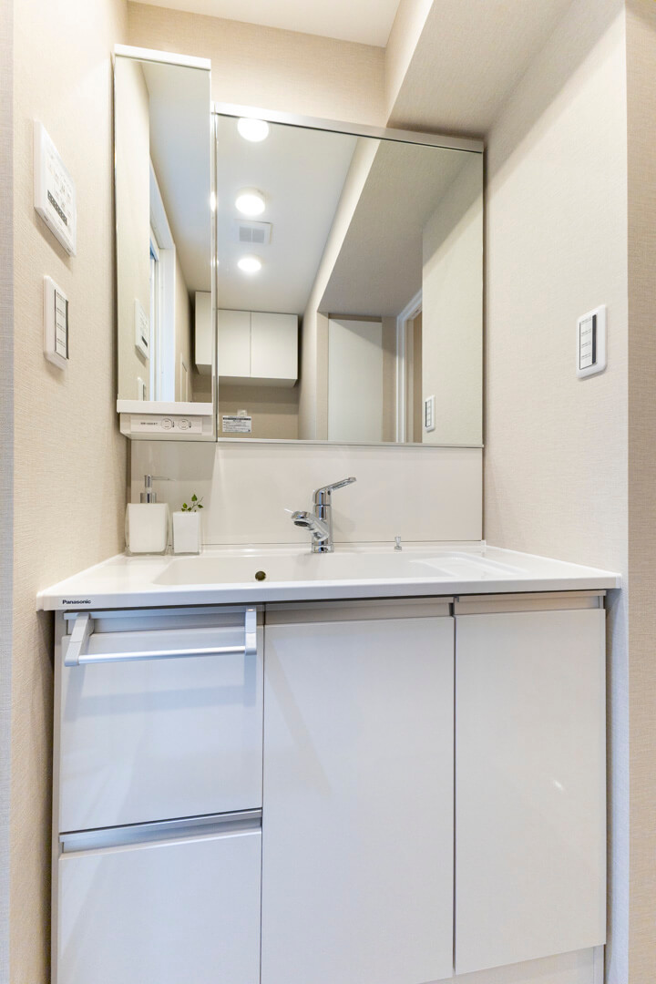 明るい印象を与えてくれるホワイトカラーの洗面化粧台。ミラーボックス(一部)、洗面下収納付きです。