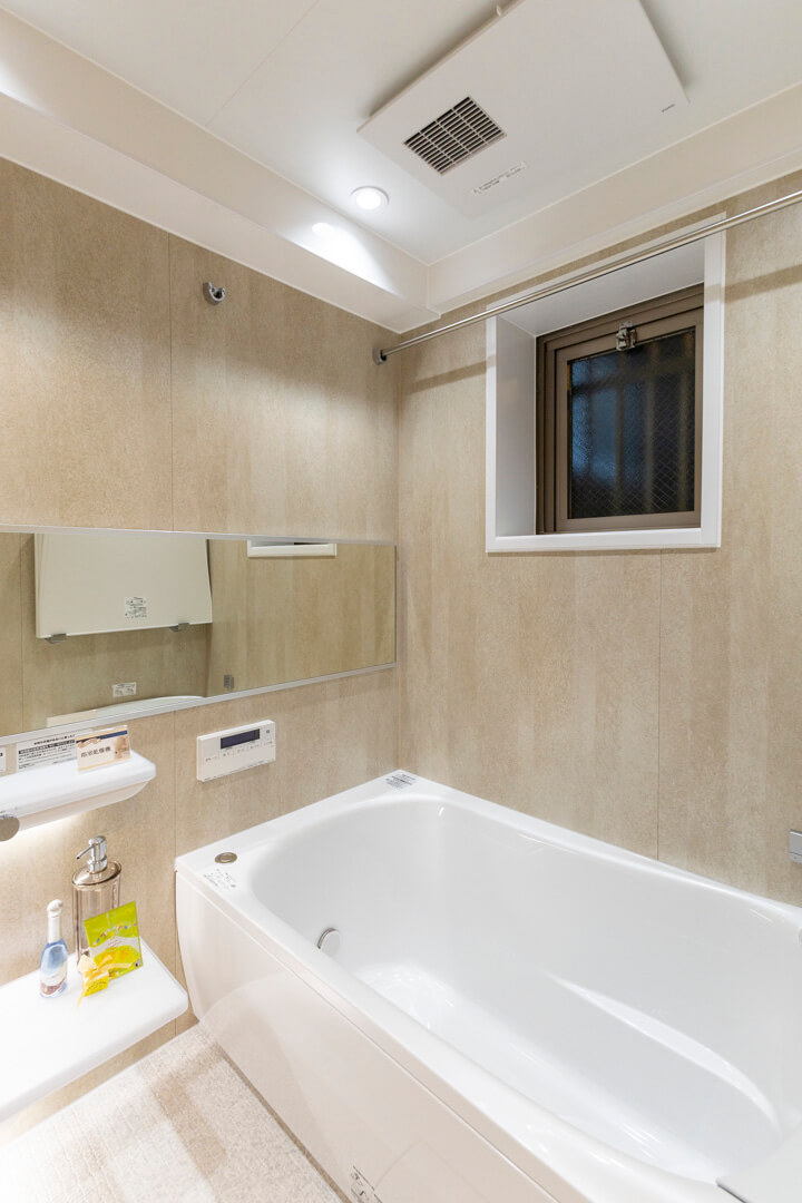 ウッド調であたたかみのある雰囲気のバスルーム。小窓付きで換気もスムーズに行えます。浴室換気乾燥とランドリーパイプ付きで雨の日や冬場の洗濯にも困りません。