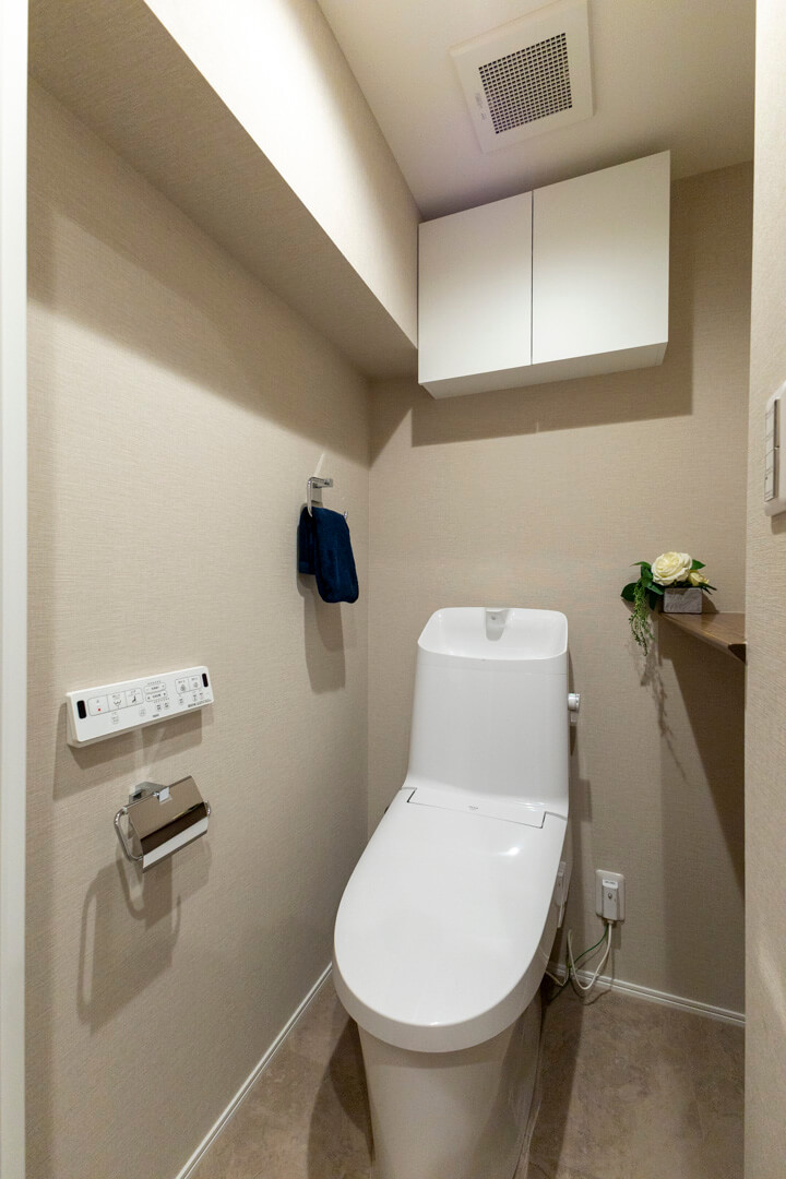 廊下に面したレストルーム。手洗いタンク付きのトイレです。ウォシュレット、収納スペースも備わっています。