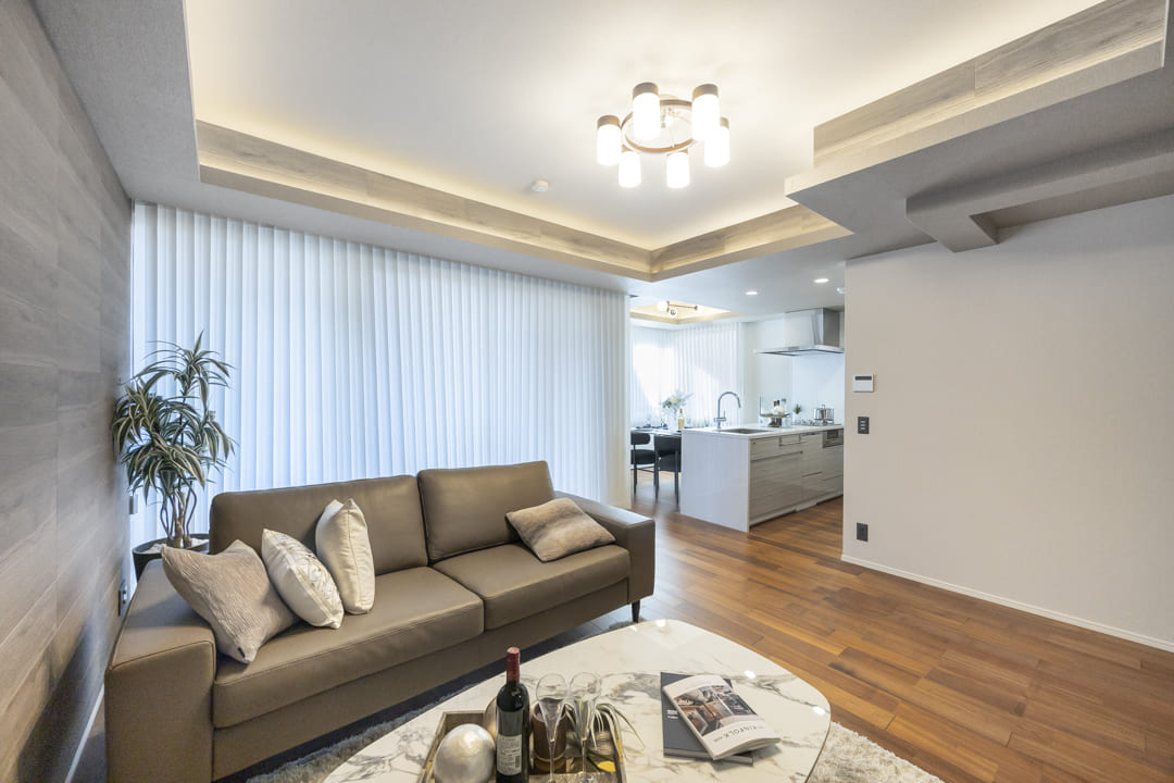 約20.5帖の広々としたリビングダイニングキッチンです。二面採光で窓が大きく造られていて、日当たり・通風が良好。リビングスペースとダイニングスペースとが、さりげなく分けられているので、それぞれの時間を堪能できそうです。