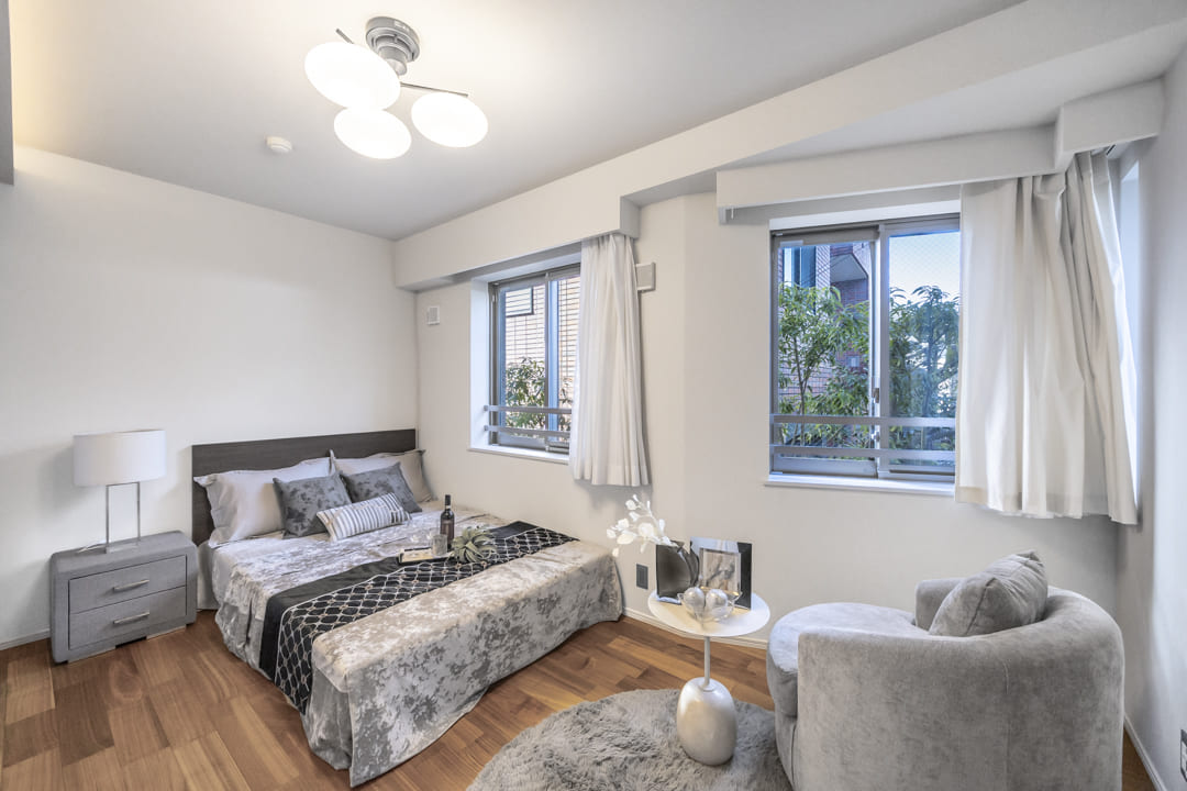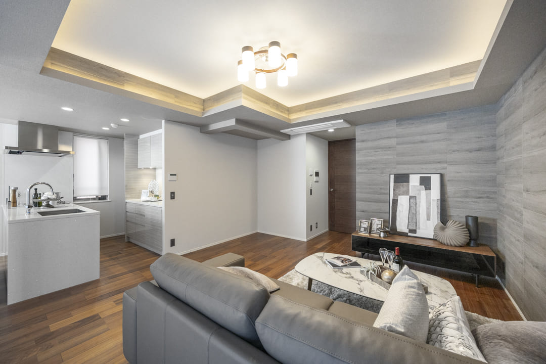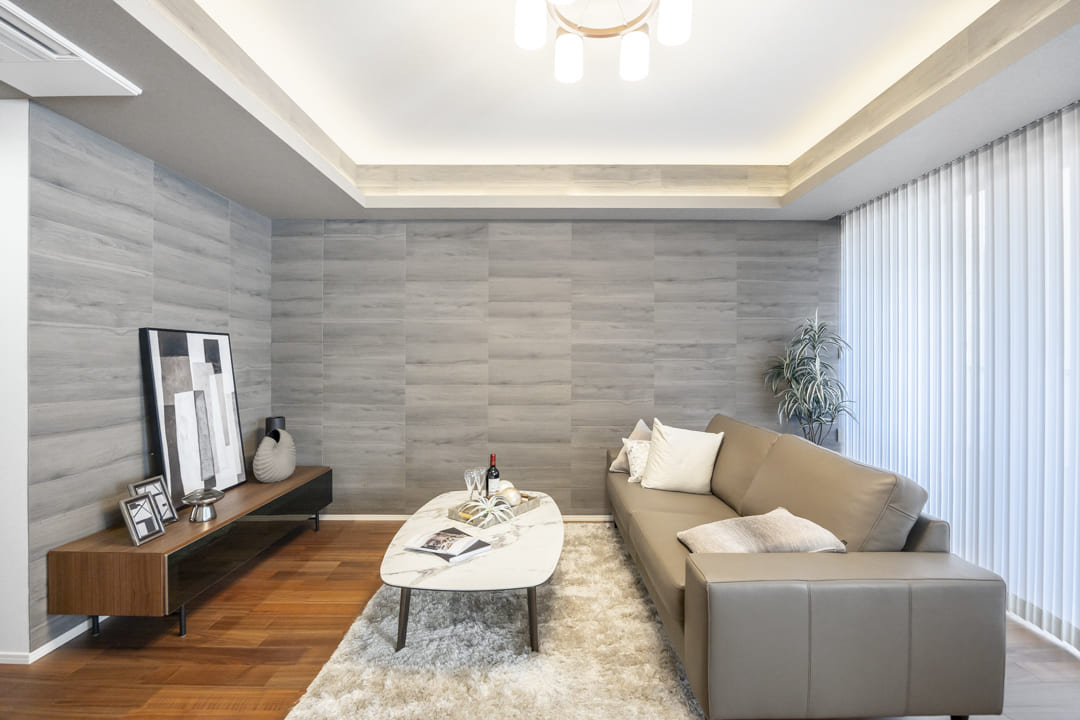 壁面や天井の一部にはグレートーンのアクセントクロスがあしらわれています。さらに、間接照明も設置されていて、お部屋を上質な空間に演出してくれていますよ。エアコンは、埋め込み式のため、インテリアの邪魔をしないのも◎。