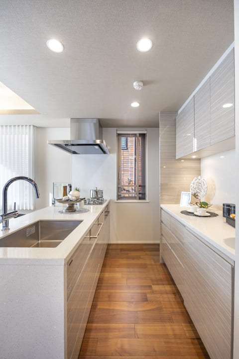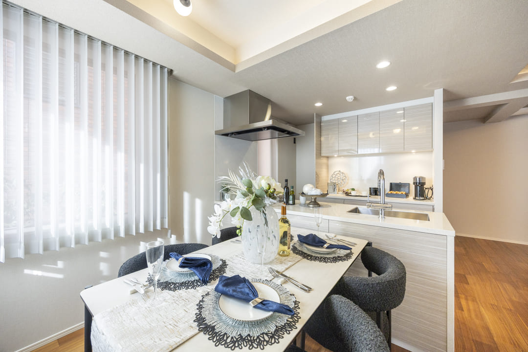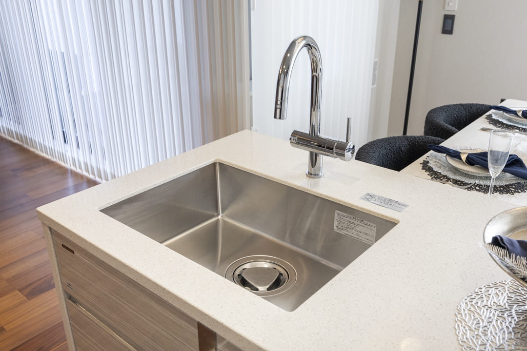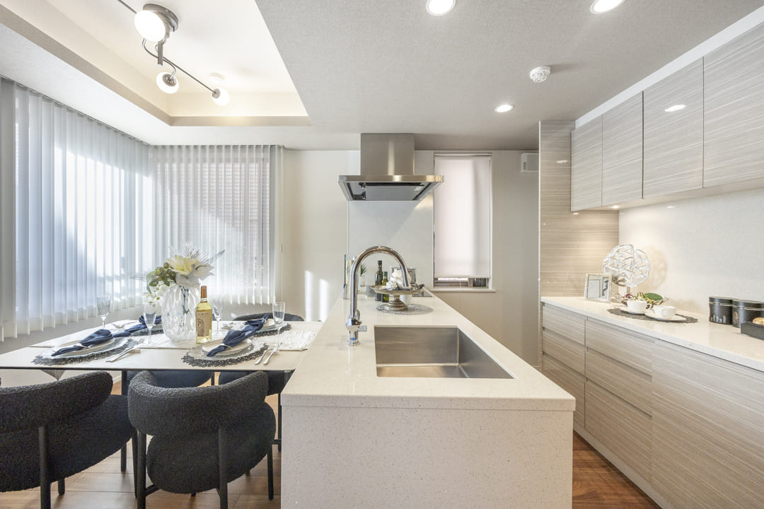 キッチンは、リビングダイニングを見渡しながら料理ができる対面式です。家族や来客とのコミュニケーションが取りやすくて◎。