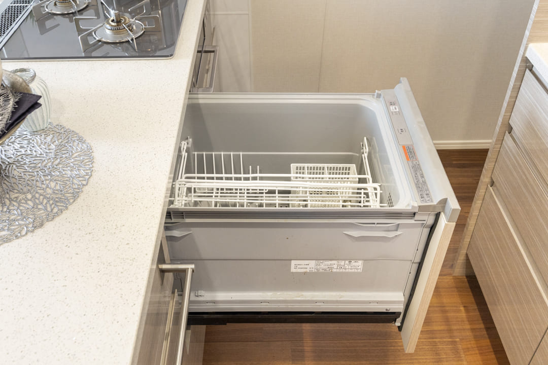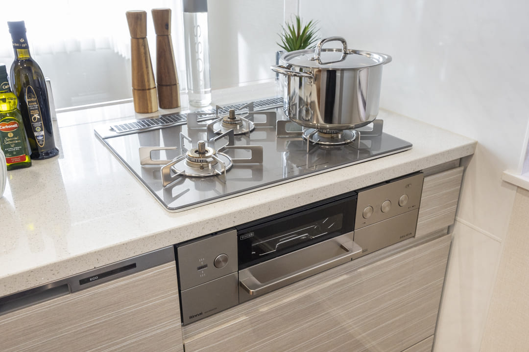 3口コンロ、グリル、食洗機付きと設備面も充実しています。シンクも広々としているので野菜などが洗いやすそうですよ。