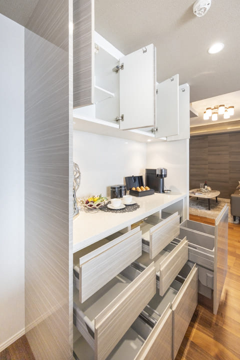 キッチンの背面側にはカップボードが備え付けられています。調味料や食器などを収納できるだけでなく、電子レンジなどを置くこともできるので便利です。ゴミ箱スペースもあります。