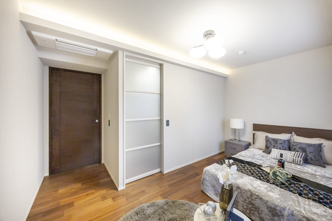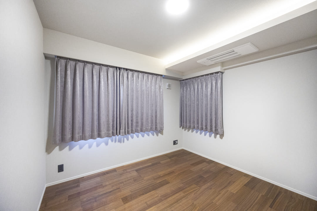 約4.6帖のゆとりがある洋室1は、主寝室に良さそうなお部屋です。天井には間接照明が設置されていて、くつろぎの空間を演出。エアコンは埋め込み式です。また、奥行きがあるウォークインクローゼットのため、洋服や大きめの荷物も収納することができそうですよ。