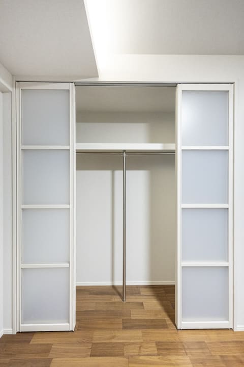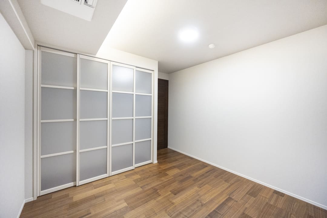 約6.8帖の洋室2は、玄関側に位置しています。二面採光で通風が良好。床暖房も付いているので、冬場でも安心です。また、色々な物が収納しやすいクローゼットが造られています。たくさんの物が収納できると、居住スペースをより有効的に使えるので嬉しいですね。