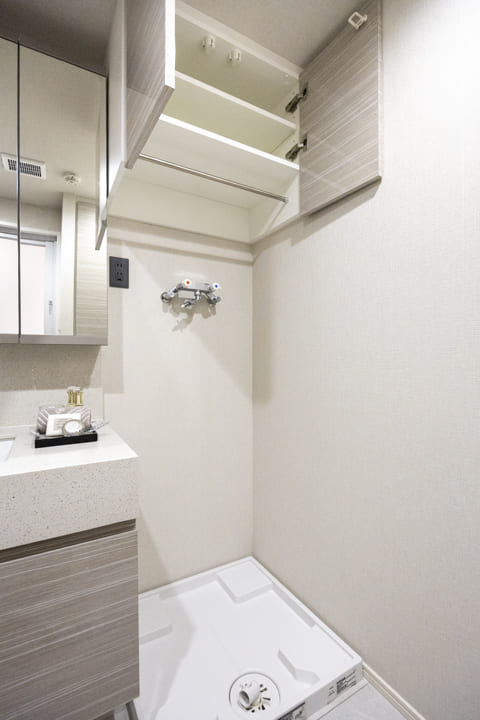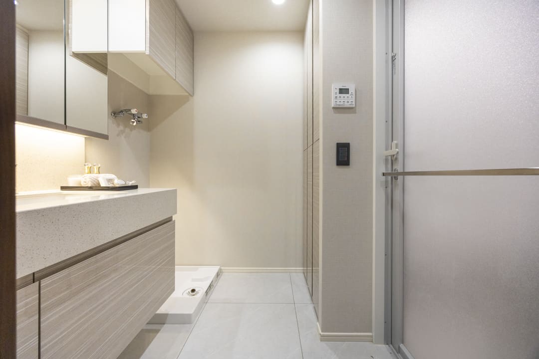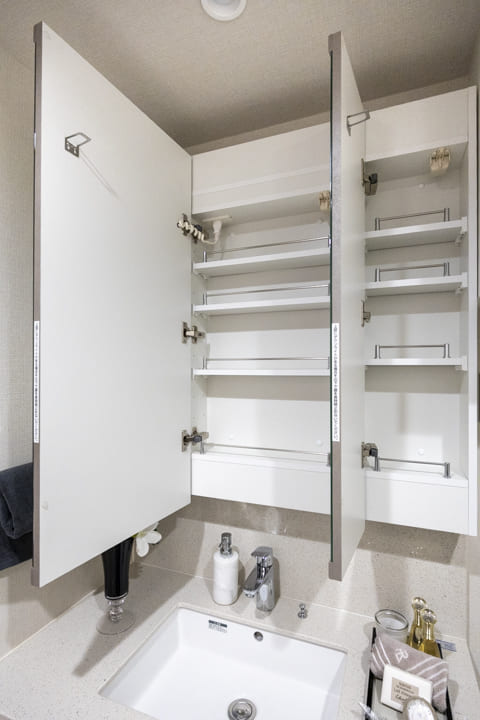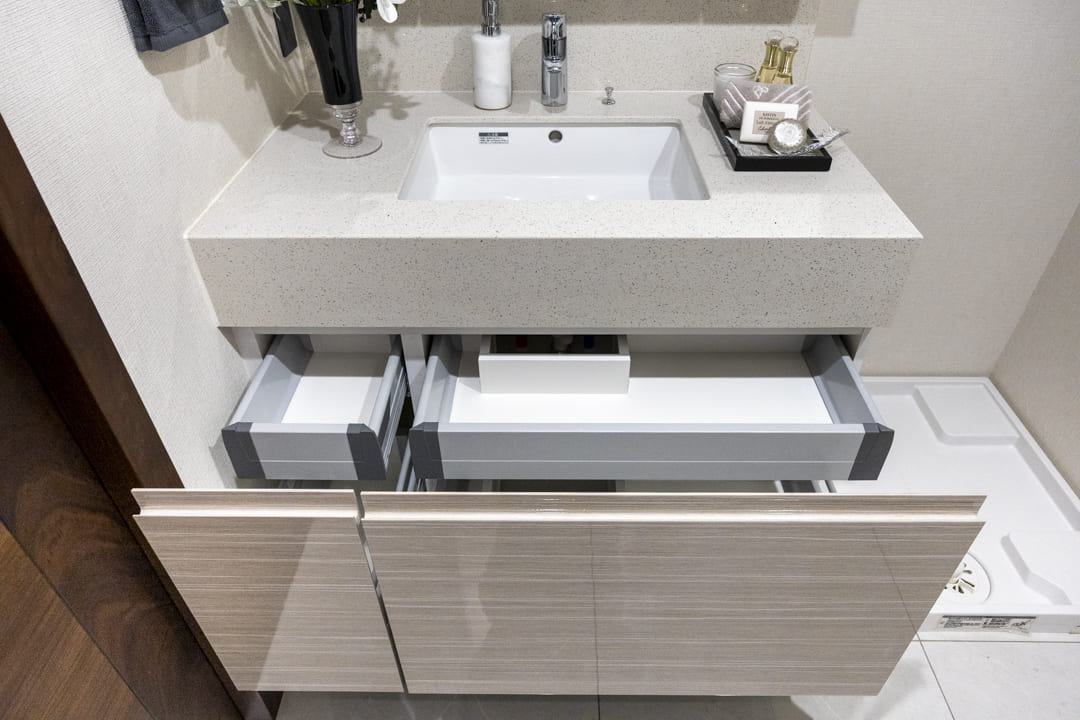 高級感のある洗面化粧台は、三面鏡の中に化粧品などが収納できて使い勝手良好。引き出しも小物が収納しやすい仕様になっています。また、背面側にはリネン庫が造られているので、ごちゃごちゃしがちな洗面まわりもきちんと整頓ができますよ。