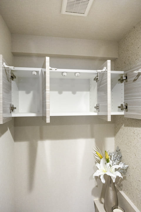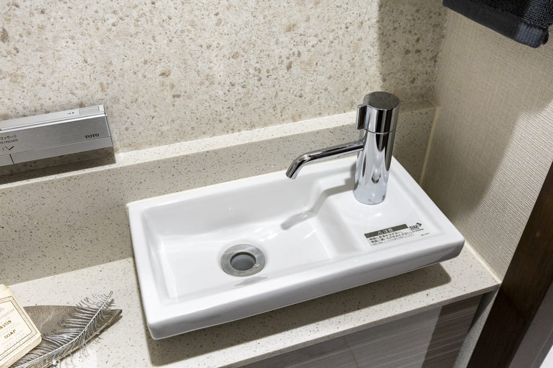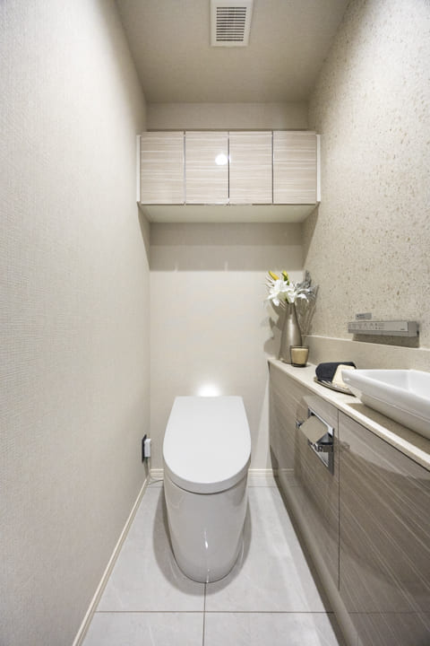 ウォシュレット一体型のトイレです。タンクレスタイプなのですっきりとした印象に。また、別途で手洗い器が造られているので、すぐに手を洗うことができて衛生的です。上部には吊戸棚が設置されていて、収納スペースもありますよ。カウンタースペースにはアロマなどを置いても◎。