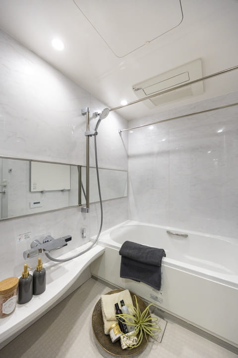 清潔感が漂うバスルームです。お風呂にゆっくり浸かるのが好きという方に嬉しい追い焚き機能を搭載。家族の入浴時間がずれてしまっても安心です。また、浴室乾燥機には暖房・乾燥・換気・涼風の機能がついており、一年中快適に過ごすことができます。