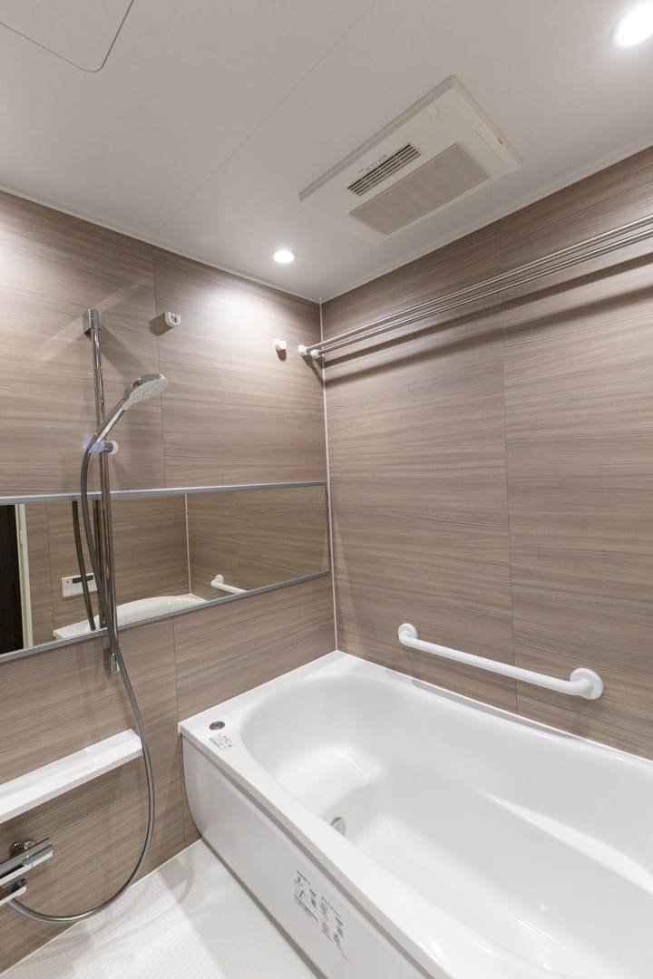木目パネルが温もりを演出するバスルーム。ワイドミラーが奥行きをもたらします。換気・暖房・乾燥・涼風機能付きで1年中快適なバスタイムに。雨の日の洗濯スペースとしても重宝しそうです。お風呂にゆっくり浸かるのが好きという方に嬉しい追い焚き機能も搭載されています。