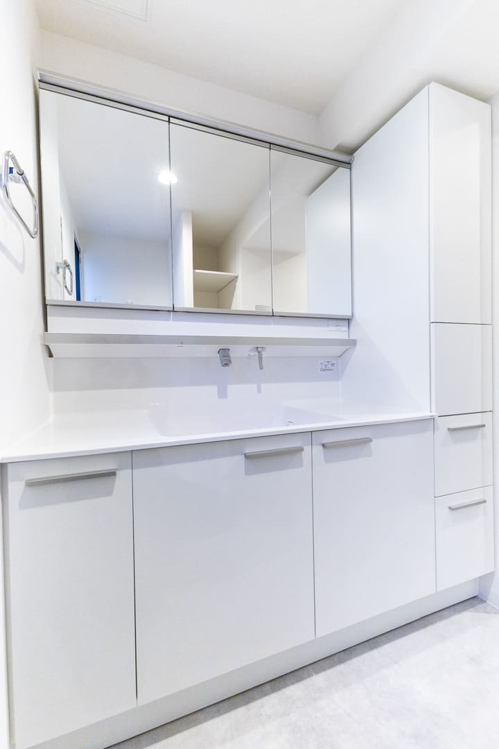白基調で清潔感のある洗面化粧台。大開口の洗面ボウルはカウンターと一体成型で、お手入れ簡単です。上部から吐水する水栓を採用していて、水栓まわりに水が溜まりにくいのも嬉しいポイントです。カウンタースペースにゆとりがあるので、化粧品やドライヤーの仮置きができて便利。キャビネット&可動棚付きで収納スペースも充実しています。