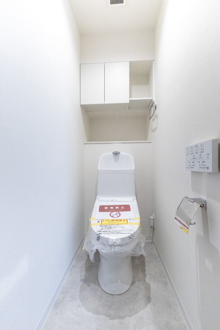 廊下に面していて独立性の高いレストルーム。TOTO製の洗浄機能付トイレに交換済みです。背面には吊戸棚とカウンターを設置。トイレットペーパーや掃除用品は吊戸棚にすっきり収納し、カウンターにはお花やディフューザーを置いて空間づくりをお楽しみいただけます。