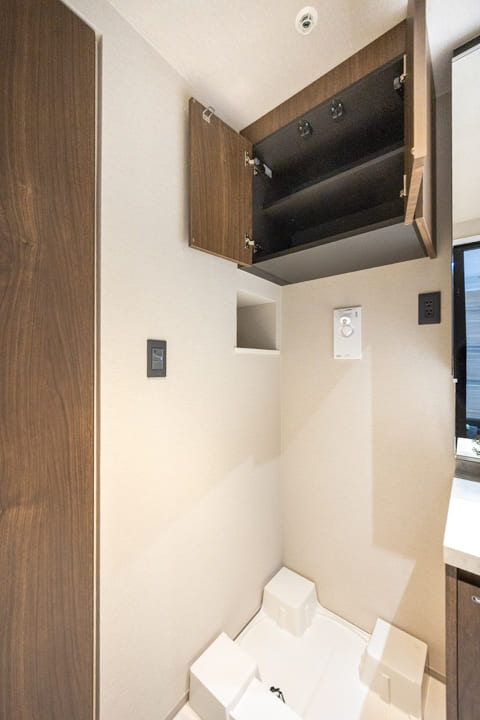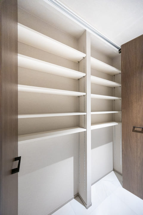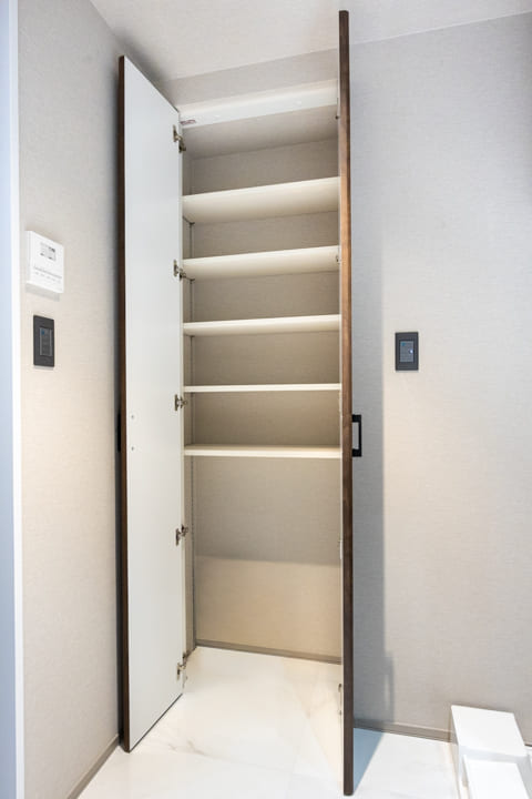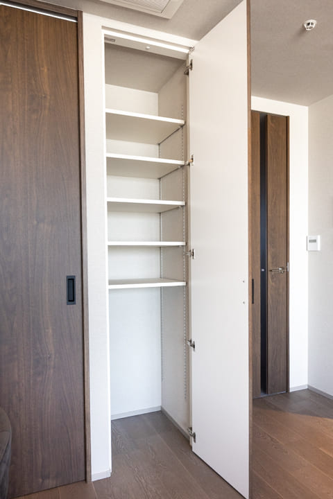 扉横には収納を完備。自由度の高い可動棚で、散らかりがちな生活小物をすっきり収納できます。扉を閉めれば生活感をしっかり目隠しでき、いつも清潔なリビング空間をキープできそうですね。