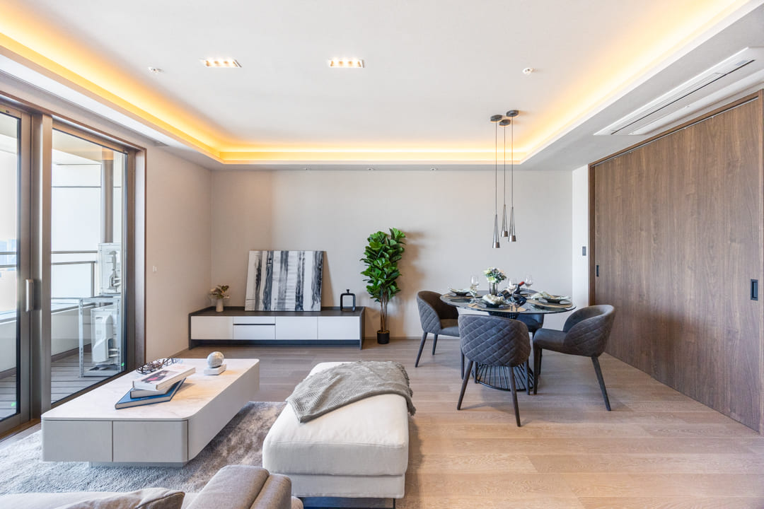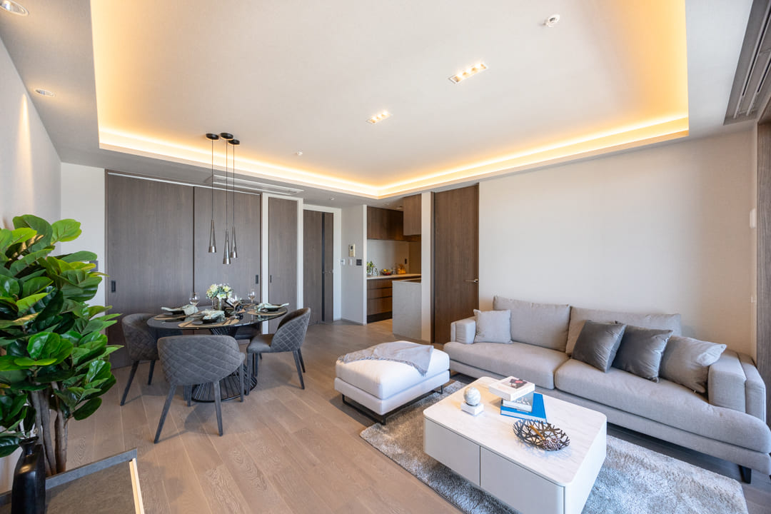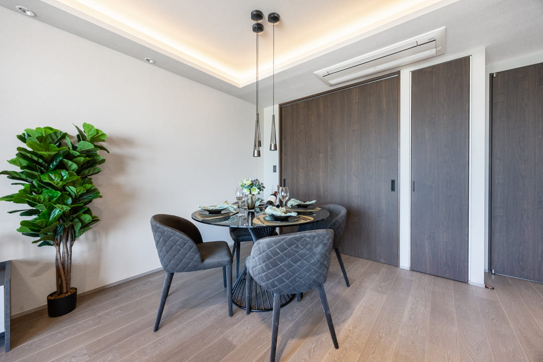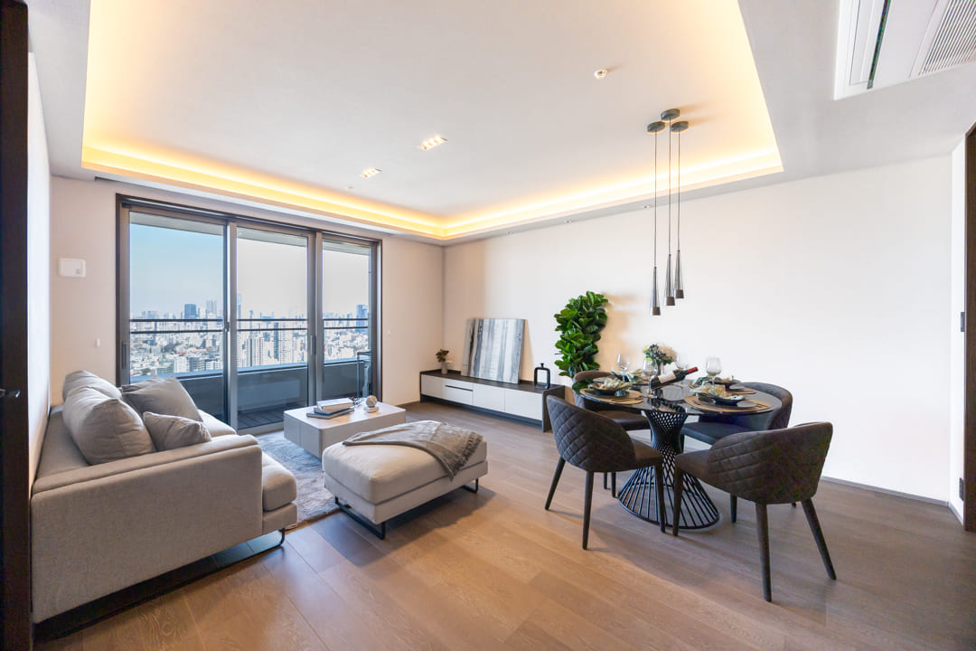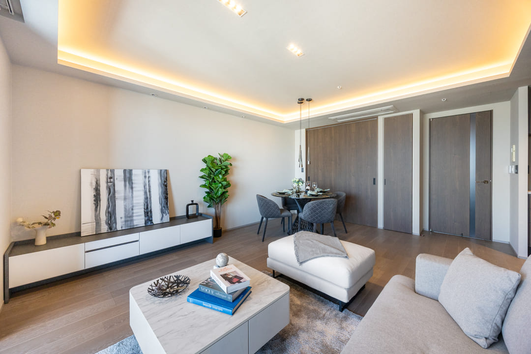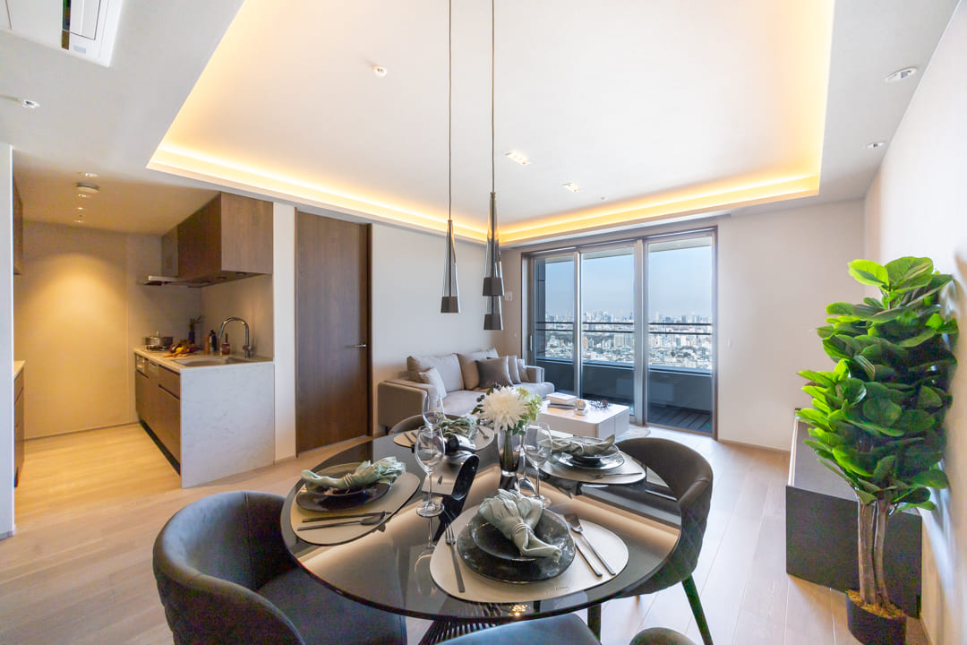 大きな窓の先に青空が広がる、開放感のあるリビングダイニング。東京タワーを望む眺めが、都心ならではの贅沢な景色を日常に取り込みます。キッチンスペースを含めて約16.6帖の広さを確保し、家族での団らんはもちろん、ゲストを迎えるシーンでもゆったりと寛げる空間。造作の間接照明がやわらかな陰影を添え、室内全体に上品で落ち着いた雰囲気をもたらします。