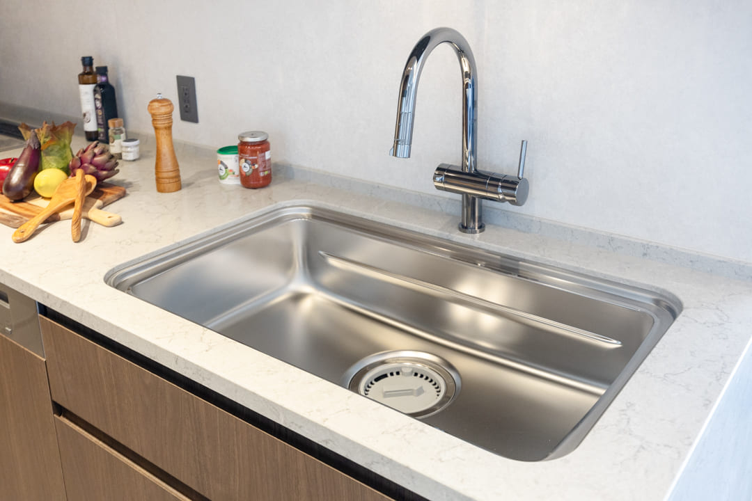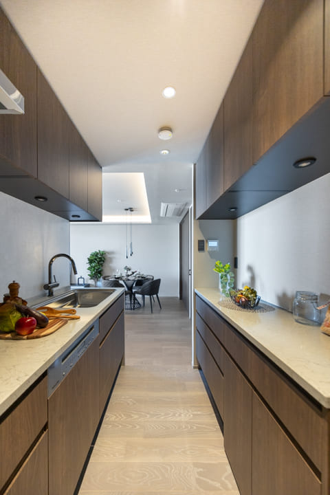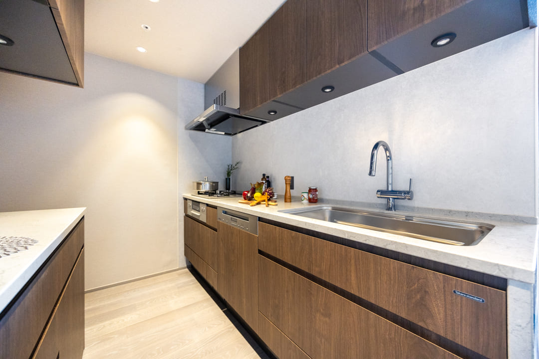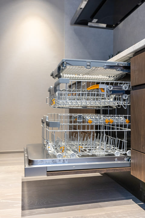 同時調理が叶うグリル付3口ガスコンロを内蔵。Miele(ミーレ)製の大型食洗機、ディスポーザーも完備されています。食器洗いが捗り、後片付けの時短に。料理後すぐに生ゴミを処理できるので、悪臭の原因を防ぎ、掃除の手間も軽減できます。
