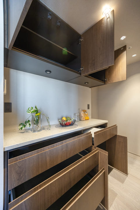 背面には収納力のあるカップボードを完備。キッチンと同じデザインで統一感があります。食料品のストックや食器類を整理整頓でき、散らかりがちなキッチンまわりがすっきり片付きそうです。カウンターにはコンセントが付いていて、家電の使用にも便利なスペースです。
