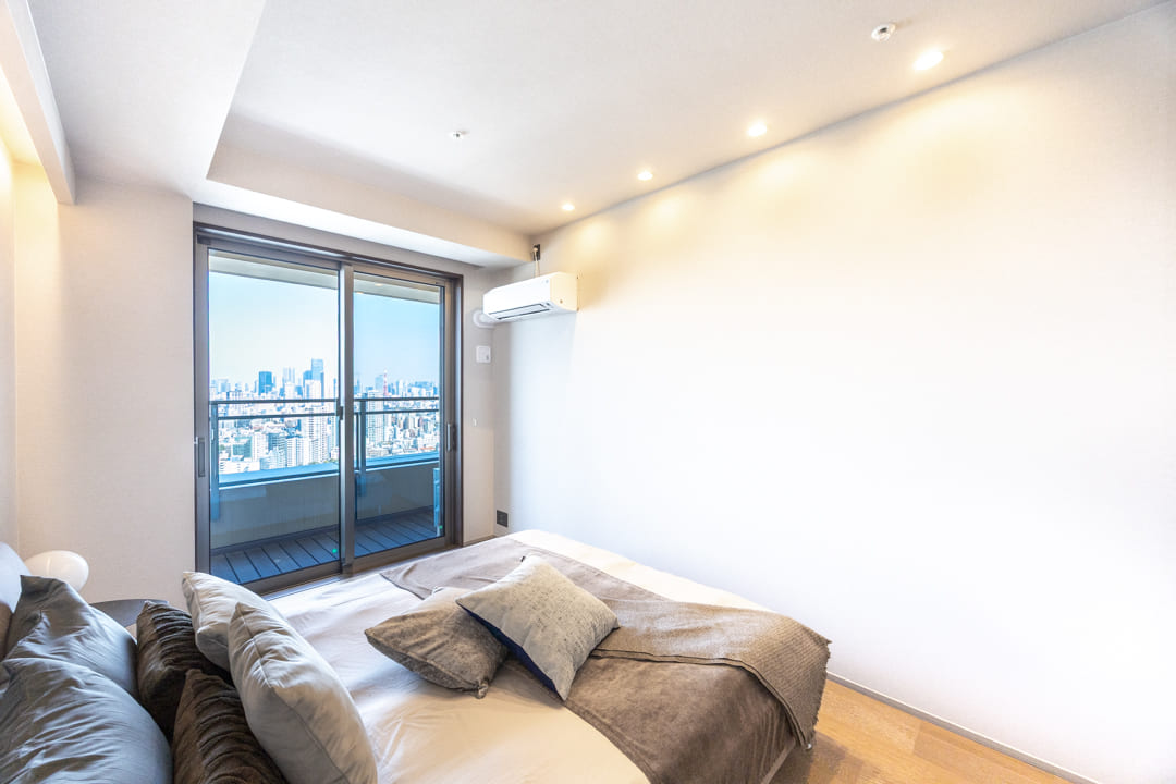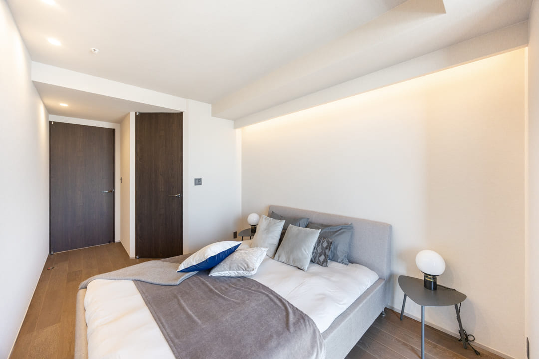 約7.5帖の主寝室。バルコニーに面した開放感のある空間で、窓の先には青空が広がります。やわらかな間接照明のグラデーションが室内を包み込み、日々の喧騒を忘れて寛げる、穏やかな時間を演出します。