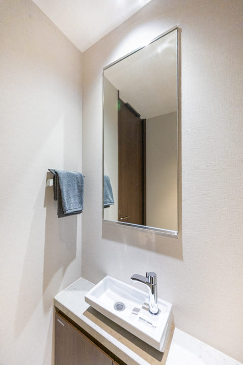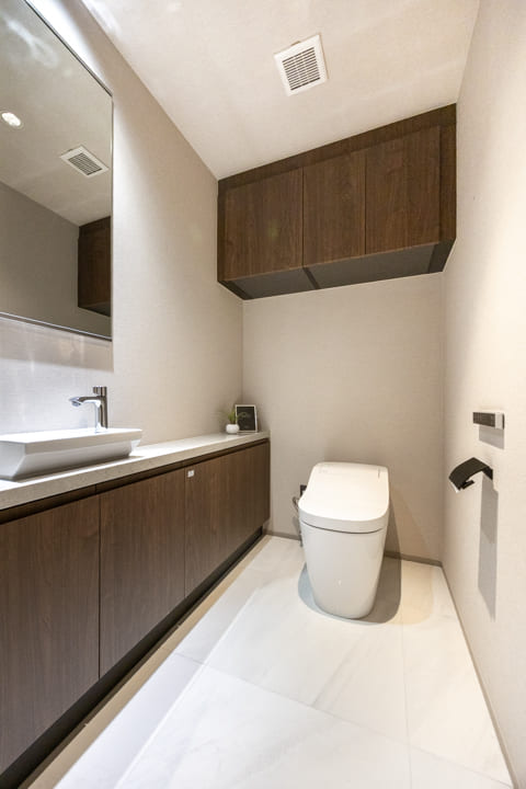 廊下に面していて独立性の高いレストルーム。スタイリッシュなタンクレストイレに新規交換済みです。手洗いカウンター付きなので、すぐに手を洗うことができて衛生的。ゲストを洗面室まで案内する手間もかかりません。トイレットペーパーや掃除用品は吊戸棚にすっきり収納してください。