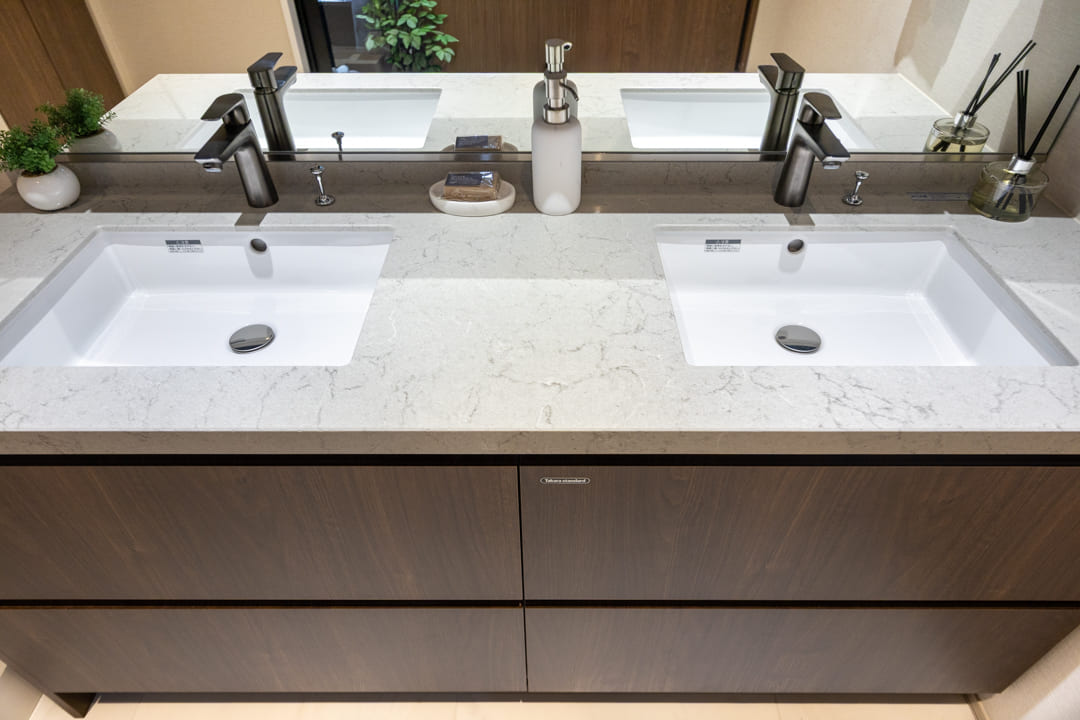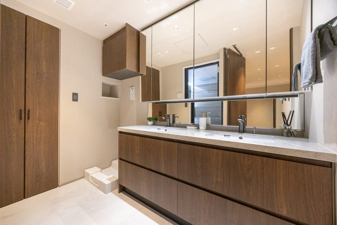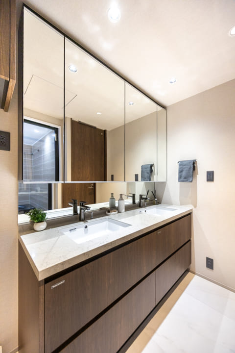 ホテルライクな2ボウルタイプの洗面化粧台。2人並んで使用でき、忙しい朝の身支度も落ち着いて行うことができます。大きな四面鏡とミドルミラーでより広々とした印象に。洗面台本体の収納に加え、リネン庫も備わっていて、収納性の高さも魅力です。いつも清潔な空間をキープできそうですね。