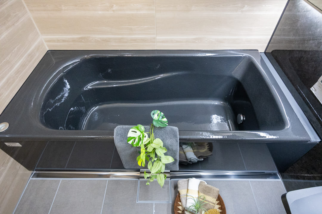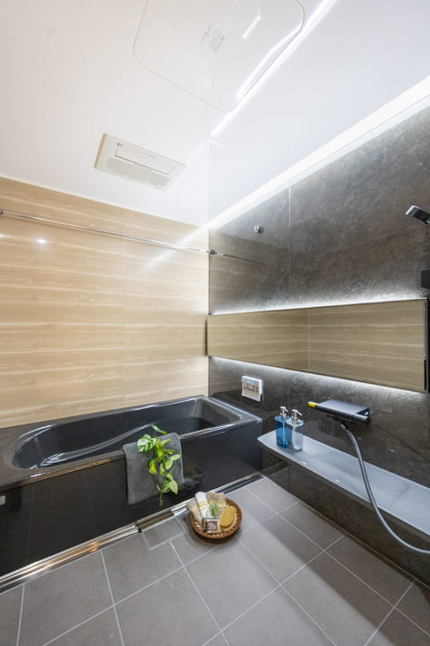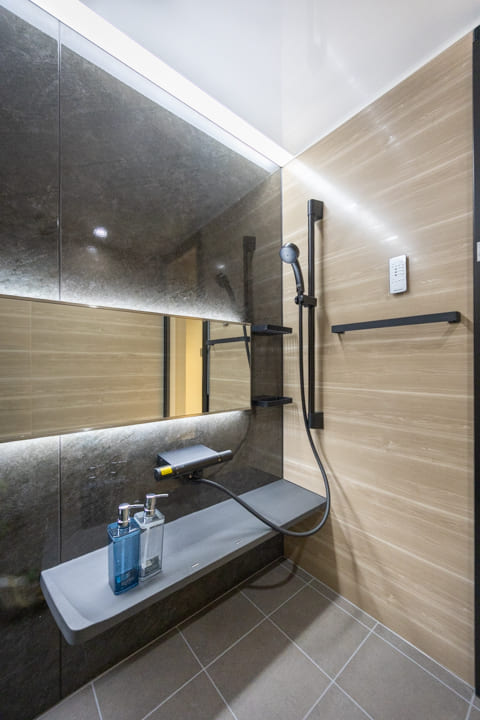 石柄と木目調の壁パネルを組み合わせた、上質感漂うバスルーム。天井に配したスタイリッシュなライン照明がやわらかな光を届け、ラグジュアリーな時間へと誘います。調色機能付きなので、目覚めのシャワーは白色、夜のゆったり入浴は電球色、といったようにシーンや気分に合わせてお楽しみいただけます。浴室換気乾燥暖房機・追い焚き機能といった設備の充実し、快適なバスタイムを叶えてくれます。